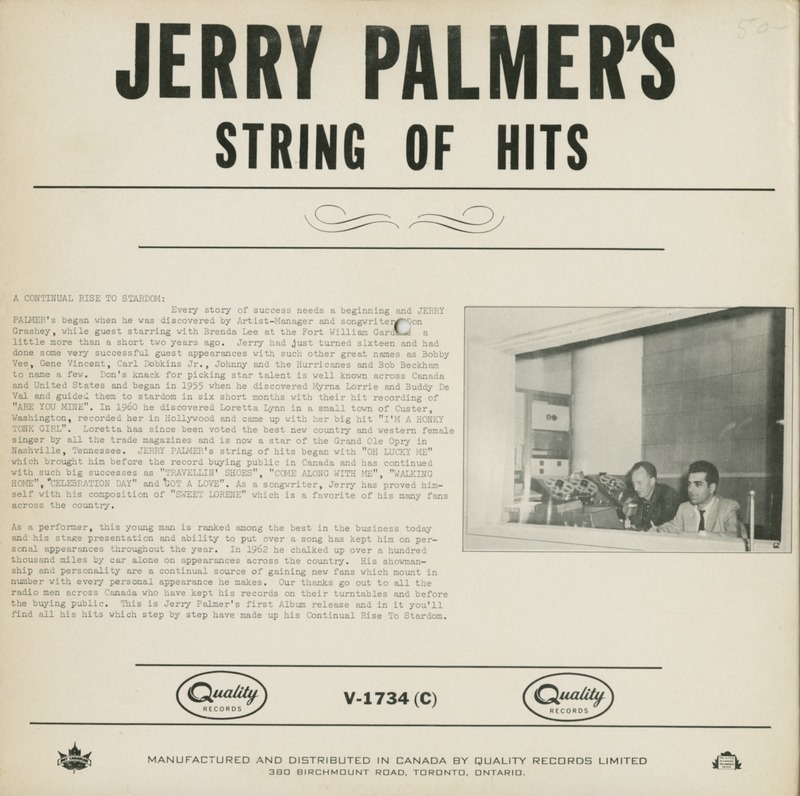 Every story of success needs a beginning and JERRY PALMER's began when he was discovered by Artist-Manager and songwriter Don Grashey, while guest starring with Brenda Lee at the Fort William Gardens and had little more than a short two years ago. Jerry had just turned sixteen and had done some very successful guest appearances with such other great names as Bobby Vee, Gene Vincent, Carl Dobkins Jr., Johnny and the Hurricanes and Bob Beckham to name a few. Don's knack for picking talent is well known across Canada and U.S.A. to date as the list of top stars he discovered with Lorraine and Buddy De Val and got started on their first big record hits built from such 45 RPM as "ARE YOU MINE". In 1960 he discovered Loretta Lynn in the hill town of Custer, Washington, recorded her on her first two hits on their own label "ZERO" A ROCKY MOUNTAIN RECORD LABEL and today Loretta is acclaimed top country and western female singer by all the trade magazines and now a big star of the Grand Ole Opry in Nashville, Tennessee. JERRY PALMER is bound to catch up to Don Grashey and be next to join his long list of winners and super stars. You will note the list of JERRY's well-selling records from "TRAVELLIN' SHOES", "COME ALONG WITH ME", "MAKING LOVE", "SILHOUETTE" and "SHADOW OF LOVE" and others. Jerry has also published a most exciting new hit song of "SWEET LORETTA" which is one of his many fans top favourites.