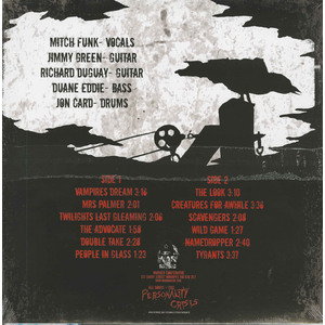 Mitch calls a guy who came to meet them when they played back in Calgary who said he played drums. Mitch told me he had his number written on a piece of paper and that he left it in his jeans and forgot about it, so it went through the wash. When he eventually found it and unfurled the compressed paper the only thing Mitch could read was the blurry phone number. He called the number. After talking to Mitch on the phone, Jon 'Metro' Card quits his job and moves to Winnipeg to join PC. This lineup plays for a while. Then Richard leaves, so they get Duane Eddie on bass. Walter Kot leaves, then Richard returns - this time on guitar. The last great lineup of Personality Crisis is Mitch Funk on Vocals, Jimmy Green on guitar, Richard Duguay on guitar, Jon Card on drums and Duane Eddie on bass. They recorded their speedy lone star epic album Creatures for Awhile (1983) in Vancouver. Hard touring, bad paying gigs and the usual early punk disorganization finally took its toll and PC slowly disintegrated after a few final shows as a four piece in '84.