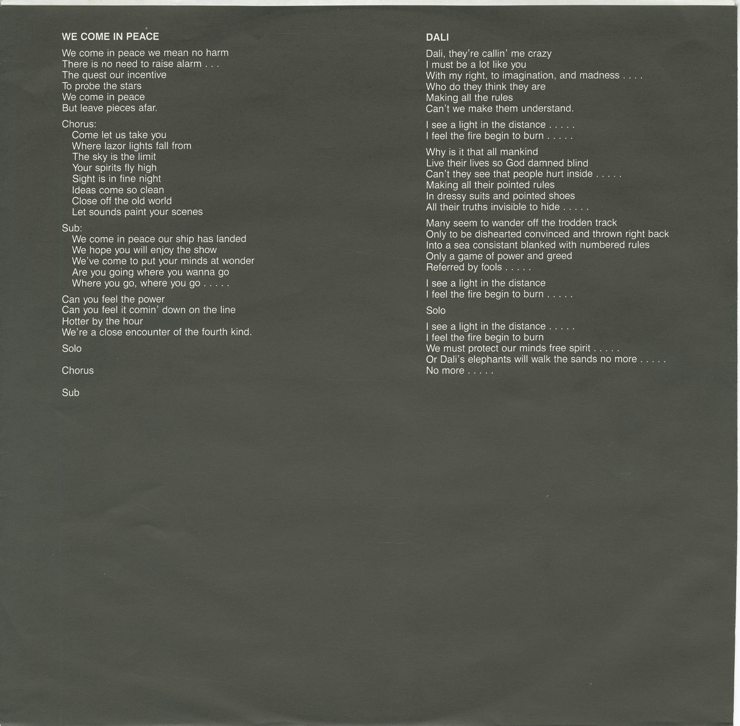 The opening track “We Come in Peace” sets the tone with eerie space transmissions, evoking the sonic palette of Steven Spielberg’s Close Encounters of the Third Kind (1977) or early ’80s sci-fi cinema, before blasting off into driving riffs, anthemic vocals, and tight instrumentation. Lead guitarist Greg Manuck, bassist Brian Morrison, and percussionist Wes Lawrie form the band’s core, delivering a sound as muscular as it is melodic. “Dali” begins as a moody ballad led by Steve Jack’s commanding vocal, but it’s Edwin Dolinski’s dramatic synth passage at the midpoint that triggers the track’s sudden transformation—igniting a storm of jagged riffs and rhythmic intensity. A classically trained pianist and early electronic music innovator, Dolinski later served as senior audio director at Electronic Arts and founded the Get Real Piano recording service.