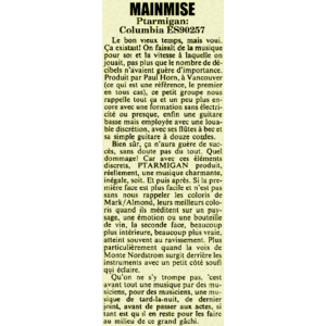 PTARMIGAN's sole recorded output is loosely dedicated to BC at a time when it was the province of the few chosen ones, but the inspiration for the dreamy vocal and woodwind passages and the hypnotically strummed guitars is readily apparent. The sense of isolation from the rest of the continent is profound in the introspection of the lyrics and every spare note wrenched from these idealistic musicians. Granted there was little space for this type of exploration in 1972 unless you were in Quebec, but I suspect Ptarmigan would have been a one-off anyway, as this disc comes off as a bit of a cathartic project for the benefit of its participants, while still being anywhere from slightly to mightily entertaining.