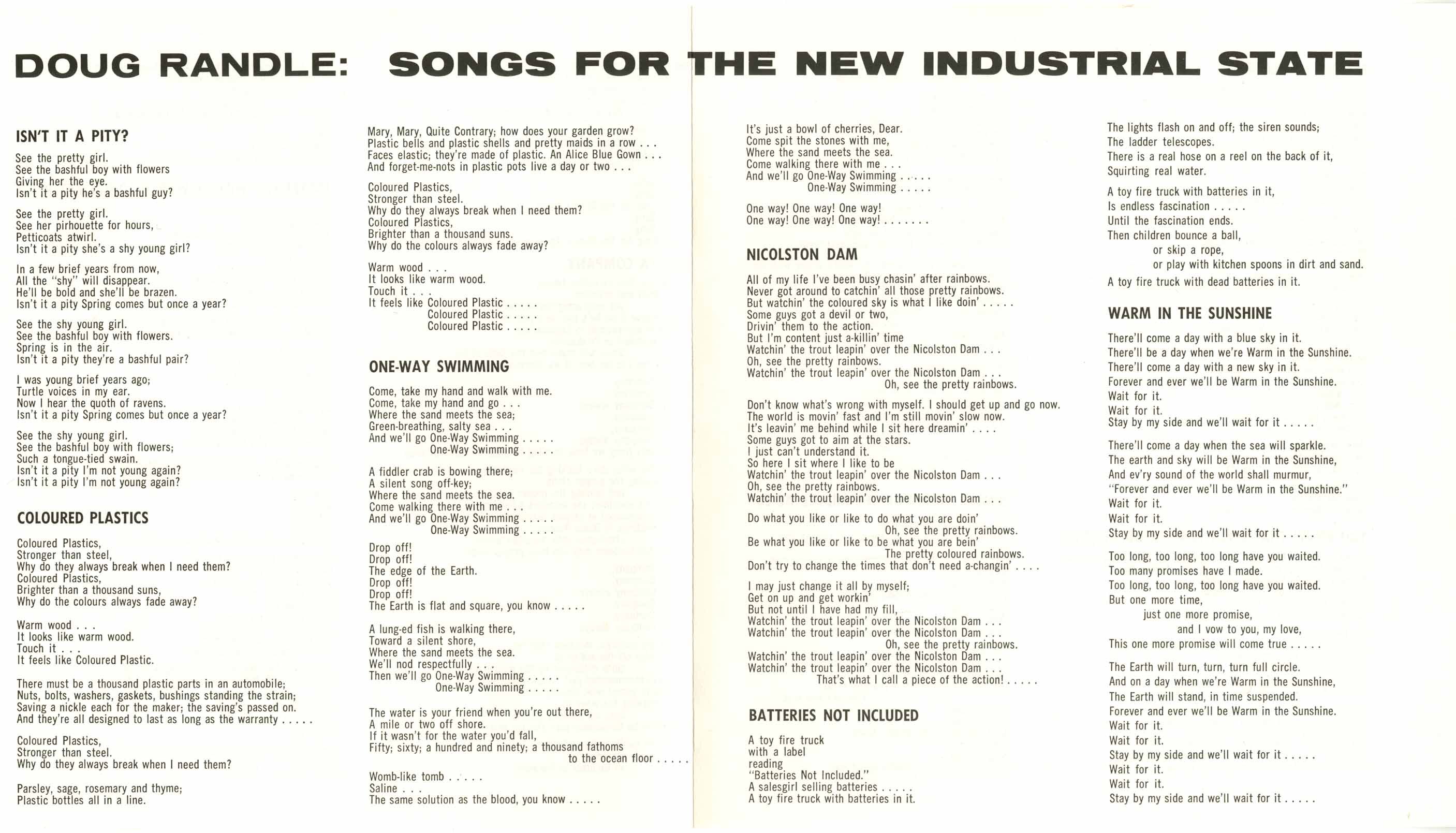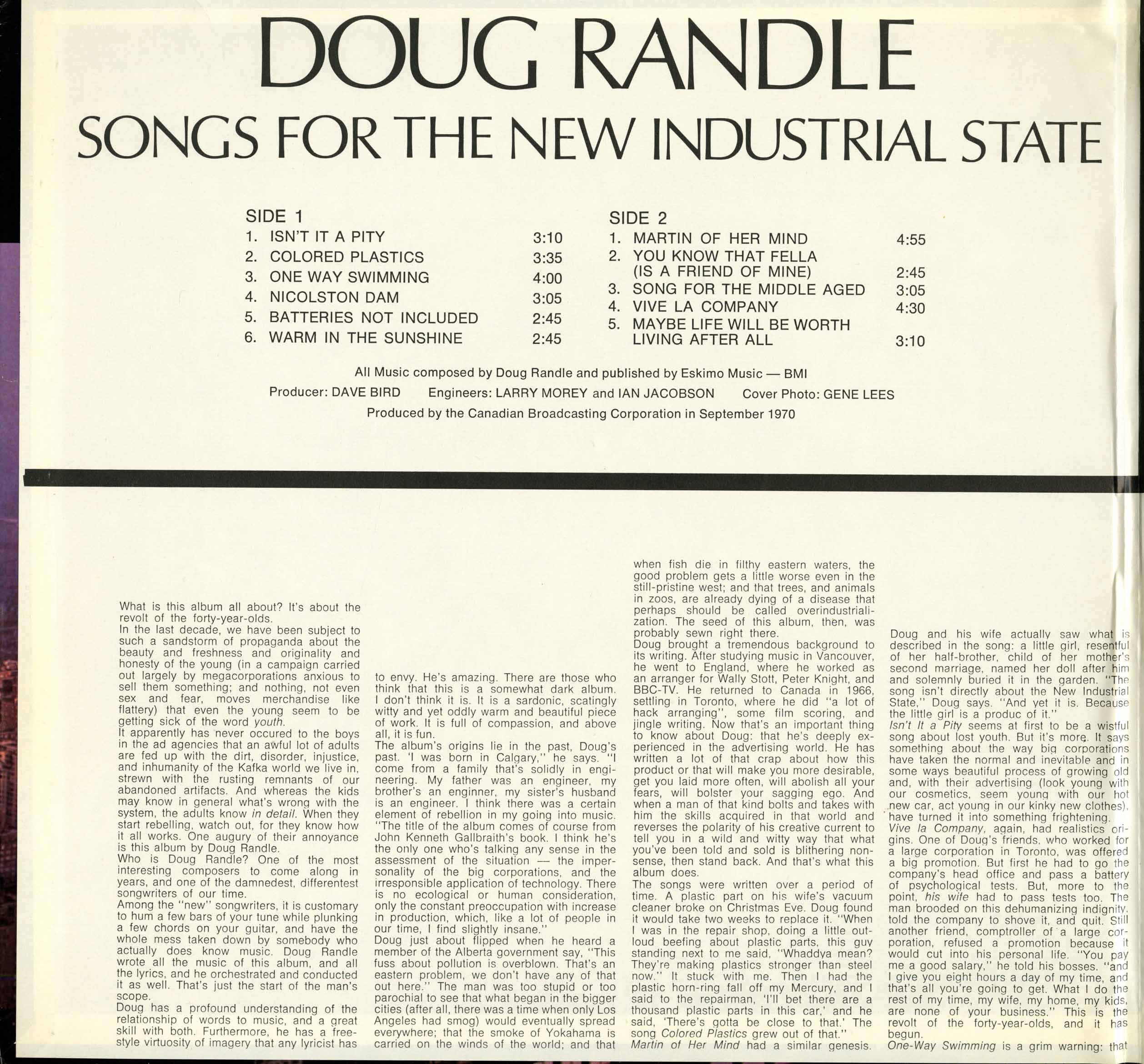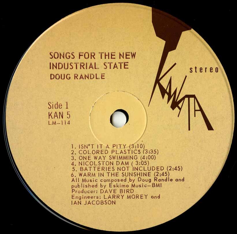 By 1970 Randle was ready to undertake his most ambitious project. Recorded at the CBC with producer Dave Bird and a band drawn from Toronto’s finest session players (Moe Koffman, Rob McConnell, Guido Basso, Peter Appleyard), Songs for the New Industrial State was issued in 1971 in a limited pressing of 500 copies on the short-lived Kanata label. Sung by Tommy Ambrose and Laurie Bower, the album merged sunshine pop, baroque orchestration, and biting social commentary. Randle’s lyrics dissected corporate greed, advertising phoniness, environmental decay, and the unease of middle age with startling candor, turning the language of jingles and commercial persuasion inside out. Songs such as Colored Plastics and Vive La Company lampooned consumer culture, while Nicolston Dam and One Way Swimming meditated on nature and escape. The album closed on a rare note of optimism with Life Will Be Worth Living After All.