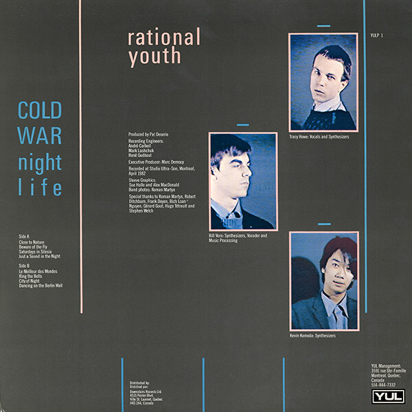 After Bill's departure, Tracy and Kevin carried on with the addition of Denis Duran and Angel Calvo, and toured extensively across Canada. In the spring of 1983, the group signed with Capitol Records and released the mini-album 'Rational Youth'. This record met with some success in Canada, but the chemistry which had existed between Tracy and Bill in Rational Youth's original conception was missing in the new configuration and this line-up disbanded at the end of 1983.