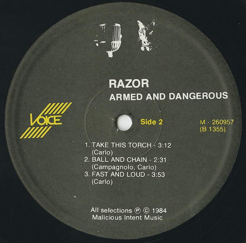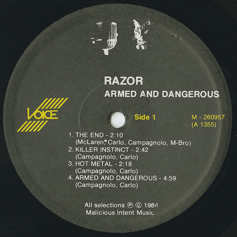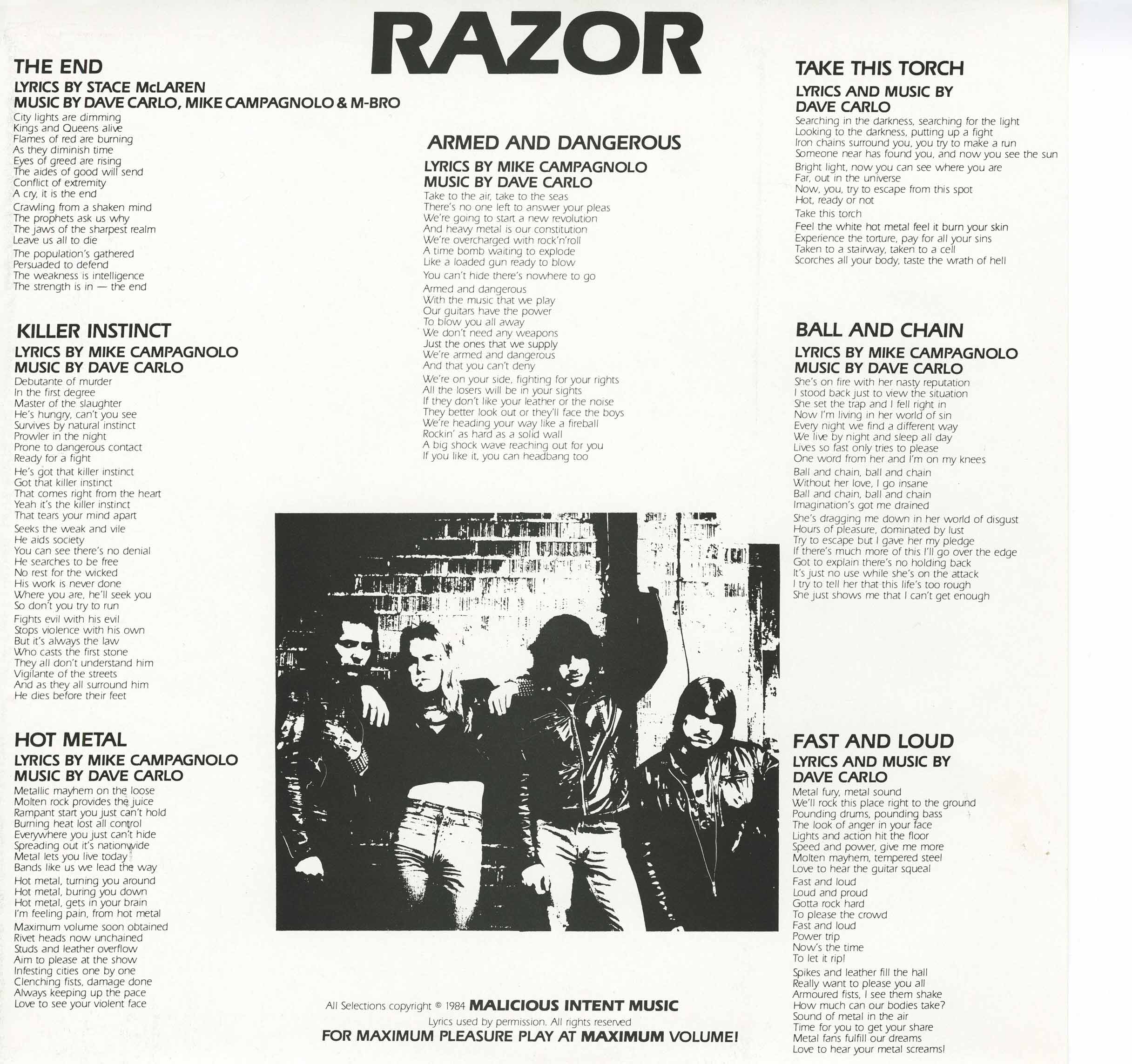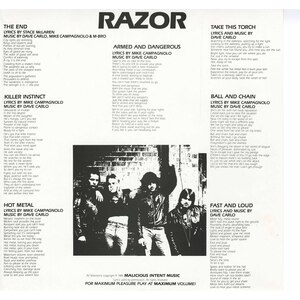 The vision began with four young men from Guelph, Ontario: Dave Carlo on guitar; Stace "Sheepdog" McLaren on vocals; Mike Campagnolo on bass; and Mike "M-Bro" Embro on drums. All of them fans of the then-new resurgence of heavy metal, they became hungry to inject the genre with a bleaker view of the world and its inhabitants: in essence, a cold, calculated assault in both melody and lyrical imagery. Their first outpouring of energy manifested itself as "Armed and Dangerous", a self-financed seven-song EP that would garner them underground acclaim via the 1200 copies pressed, and countless tape trading. This was all that was needed to secure a recording contract with Canada's Attic Records, with whom Razor would record their next three albums.