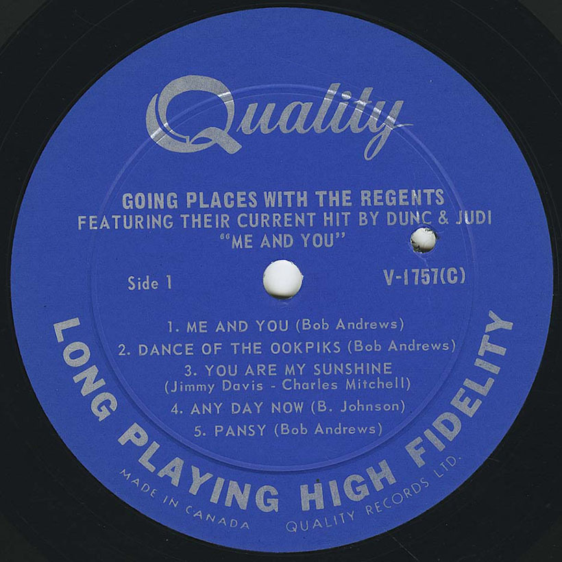 By May 1, 1965, "Me and You" was charting. It was at #3 in the Billboard Hits of the World, Canadian Records division of the Canadian chart, just behind "Walk that Walk" by David Clayton Thomas & Quintet. The following week both singles had maintained their positions. For the week ending May 3rd, 1965, the song had moved up from #5 to #3 on the R.P.M. play sheet. The single was released in the United States on the Blue Cat record label. Moving forward with the success of their single, Billboard noted it in the May 8, 1965 issue that Quality Records were releasing the album, Going Places with the Regents and that the hit single would be included. One of the first US radio stations to play the song was KYNO in Fresno. The station would later get an award from Quality records for breaking out "Shakin' All Over" by The Guess Who.