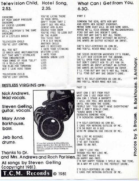 Formed in 1980, the group consisted of Nick Andrews (vocals), Steve Gelling (guitar, vocals), Mary Anne Barkhouse (bass), and Jeb Bond (drums). Several of the members had previously played together in short-lived high school projects such as the Tuesday Club Murders, but it was as the Restless Virgins that their vision coalesced. The name itself was borrowed from a proposed all-female band that never materialized; Andrews and Gelling decided it was too good to waste.