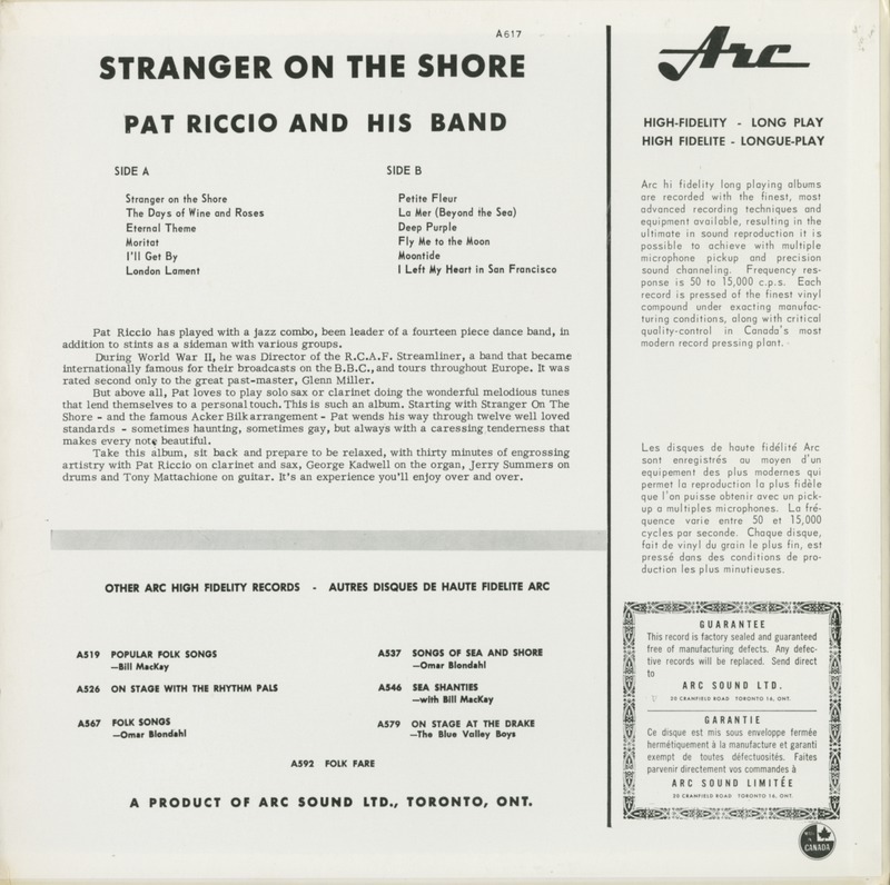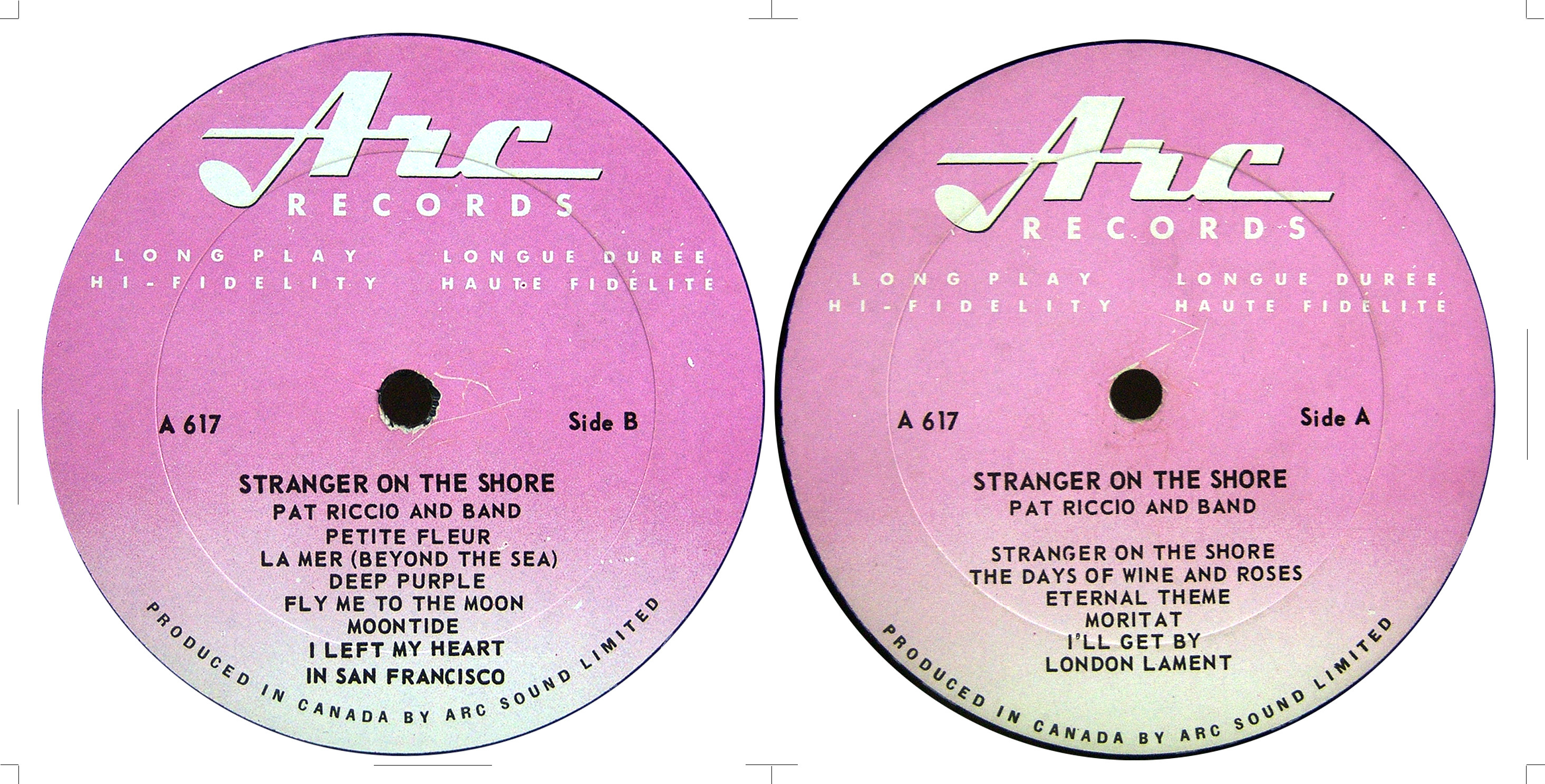 Riccio recorded widely from the late 1950s into the 1960s, leading both small jazz combos and large orchestras. His Basic Sounds of the Pat Riccio Quartet (1959, Quality) introduced his refined small-group style, while The New Big Band Sound of Pat Riccio (1961, Arc) showcased his power as a bandleader in full swing, captured live at Oshawa’s Jubilee Pavilion. Later, his association with the Canadian Talent Library brought further recordings, including a collaboration with jazz piano giant Teddy Wilson. These albums, distributed to radio stations across the country, kept Riccio’s sound in Canadian homes for years.