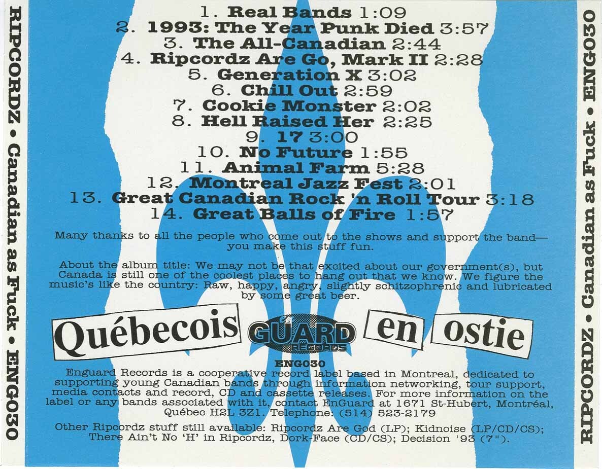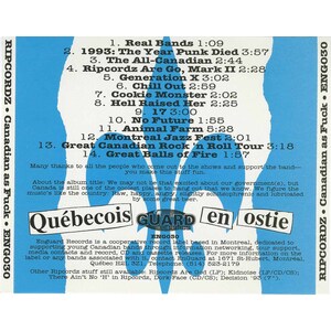 Formed in 1980, the band played various basements and dives before deciding they really didn’t have anything better to do and really started paying attention to what they were doing. The result, their first album, “Ripcordz Are Go(d)” released in 1988. Since then, they’ve released ten full-length albums, gone on 13 cross-Canada tours and played well over a thousand shows (they stopped counting a while back). The sound includes a mix of rock ‘n roll, hardcore, Punk and pop (mostly Punk, we’d say). They like to describe it as a glob of distortion that bursts out of your speakers and soils the rug so your parents have to clean it up. (The band likes to say that, but the record company wishes they would stop…) They’ve played with a wide variety of alternative bands including Rancid, Nirvana, Anti-Flag, Lydia Lunch, DOA, The Misfits and a host of others. Rancid was even nice enough to call them “Canada’s best Punk band.”