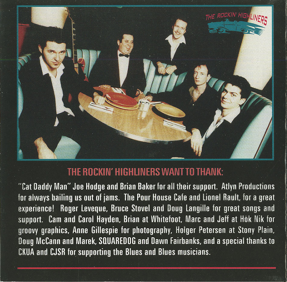 “Cat Daddy Man” Joe Hodge and Brian Baker for all their support. Atlyn Productions for always bailing us out of jams. The Pour House Cafe and Lionel Rault, for a great experience! Roger Leveque, Bruce Stovel and Doug Langille for great songs and support. Cam and Carol Hayden, Brian at Whitefoot, Marc and Jeff at Hök Nik for groovy graphics, Anne Gillespie for photography, Holger Petersen at Stony Plain, Doug McCann and Marek, SQUAREDOG and Dawn Fairbanks, and a special thanks to CKUA and CJSR for supporting the Blues and Blues musicians.
