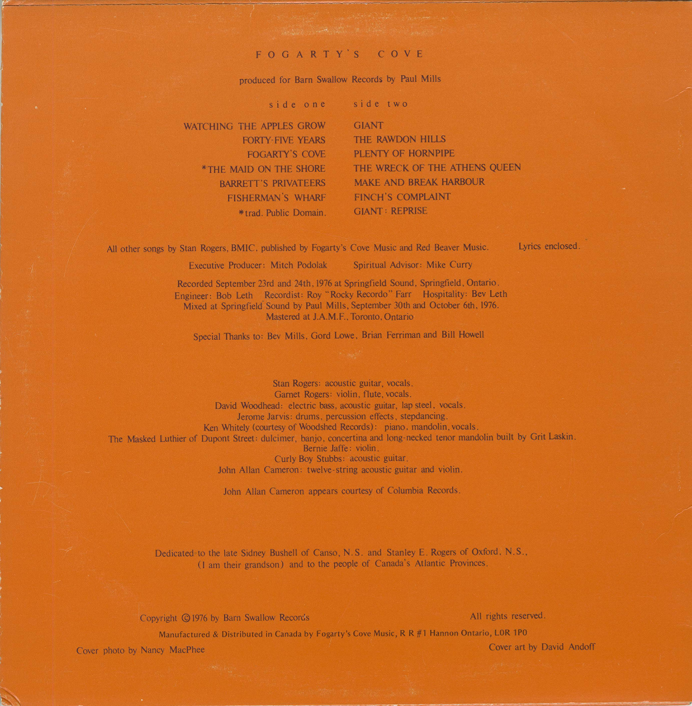 Stan Rogers: vocals, acoustic guitar,12 string guitar, long neck mandolin