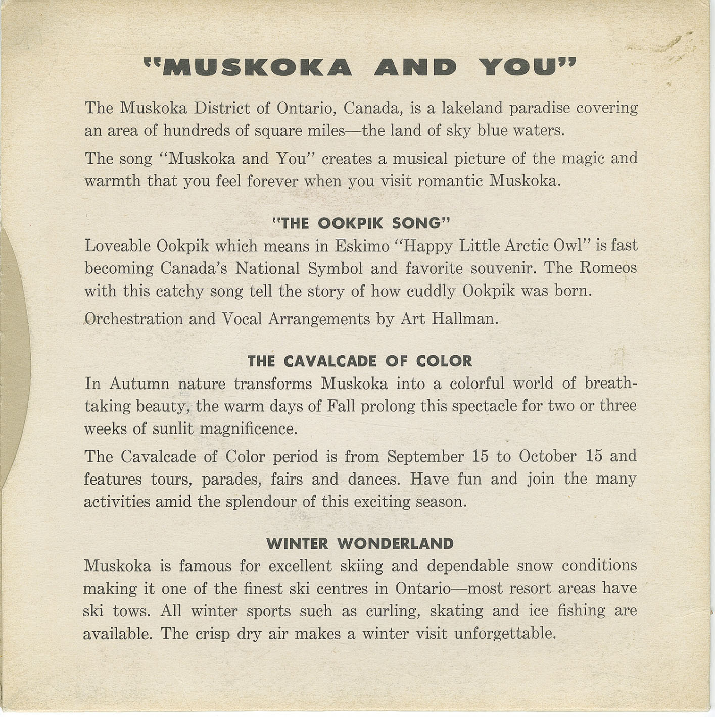Written by Vern Kennedy and Alex Ticknowich (The Ookpik Song); and B. Sutton - W. O'Connor (Muskoka and You)