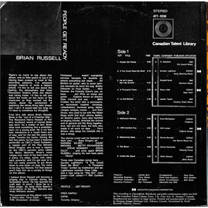 The personnel on this album read like a who's who. Terry Clark ... former Fifth Dimension drummer ... Don Thompson ... makin' everybody nervous because he doubles on almost everything but reeds ... Ed Bickert on guitar ... Bobby Edwards on fuzz guitar ... Rick Homme, the Friendly Giant's son, on bass ... Jim Pirie on banjo and guitar ... Eugene Amaro on electric flute, clarinet and sax ... Mike Craden, the artist who is percussive, on microtonal treebell, vibraslap, rattleshakers, burmese gong, tablas, congas, bongos, claves ... and Gary Gross, who used to be witht he Helen Noga outfit that built Johnny Mathis, on electric piano ... and last but not least, the fella who made it all work on tape ... Terry Brown, who plays his console like it was a moog.