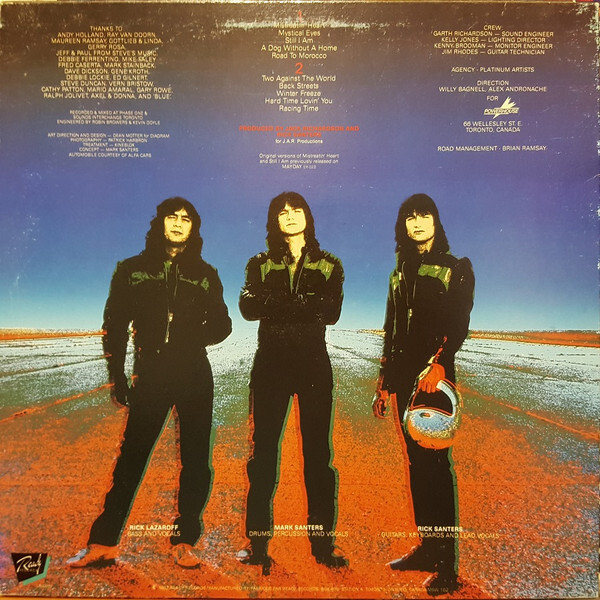 This time around the band had two weeks to record and mix (double the time and budget of the first album!). The “Racing Time” album featured not only an all-new line-up of songs but of musical equipment as well. Rick Santers replaced his 50 watt Marshall with a pair of Mesa Boogie amps with 4×12” Celestian speaker cabinets. Rick’s 1969 gold top Gibson Les Paul was stolen so his 1964 Fender Stratocaster wound up playing an exclusive solo role on the album. On “Dog Without A Home” Rick used a talk box to growl out the guitar solo, and a wah-wah pedal was featured on the guitar solo for “Road to Morocco”. A Roland Super Jupiter synthesizer was used to enhance the grand intros for “Mystical Eyes” and “Back Streets”. Mark replaced his Ludwig kit with a set of double-headed Sonar drums, along with Zildjian cymbals and Rick Lazaroff made the switch to a Fender Jazz bass into an Ampeg SVT head with JBL 4530 bass bins and a custom-built JBL 2×12″ cabinet.