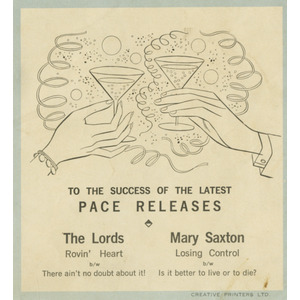 “One of the things about joy is that once you're lucky enough to feel it, you don't always succeed in expressing it for yourself or for others. But there's one girl — a dark-eyed entertainer of charm and warmth who does and can help you to do it too. Mary Saxton can make you feel good, simply because she is so obviously 'feelin' fine' and her songs will definitely please you. Mary has been singing professionally for many years in Western Canada, both on radio and television and has been active in album work as a back-up vocalist. Her talents as a songwriter come to light for the first time on this recording and with help from arranger Curt Watts, Mary shows you that music is her life. Please share it with her.”
