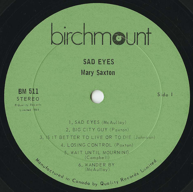 “One of the things about joy is that once you're lucky enough to feel it, you don't always succeed in expressing it for yourself or for others. But there's one girl — a dark-eyed entertainer of charm and warmth who does and can help you to do it too. Mary Saxton can make you feel good, simply because she is so obviously 'feelin' fine' and her songs will definitely please you. Mary has been singing professionally for many years in Western Canada, both on radio and television and has been active in album work as a back-up vocalist. Her talents as a songwriter come to light for the first time on this recording and with help from arranger Curt Watts, Mary shows you that music is her life. Please share it with her.”