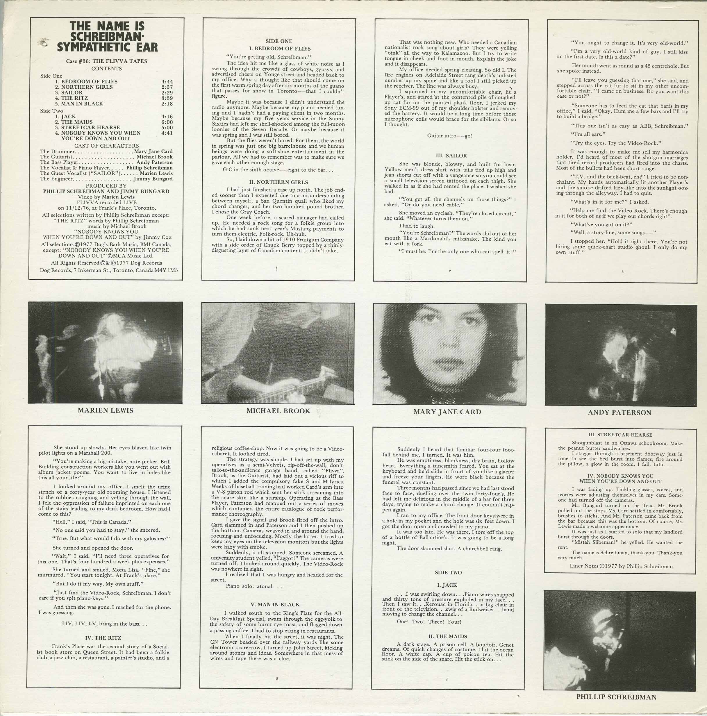 "FLIVVA'S album (sympathetic ear), a limited Dog 001 release, it still available at Sam's, Records on Wheels, Record Peddler, Millwheel, Canadian Spaces, Beachside Records Works and specially Cheap Thrills (Phil says buy here!). Peter Goddard said it was "a stunning work", "classy and controlled decadence". John Heimbecker, CKMS FM called it "rock and roll for the enlightened eighties", and "the best debut since QUEEN". Wilder Penfield referred to its "first rate songs" as "sardonic". SHADES No.4 encouraged Phil Schreibman to say lots fo things for himself. So don't miss it and then be sorry you did."