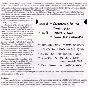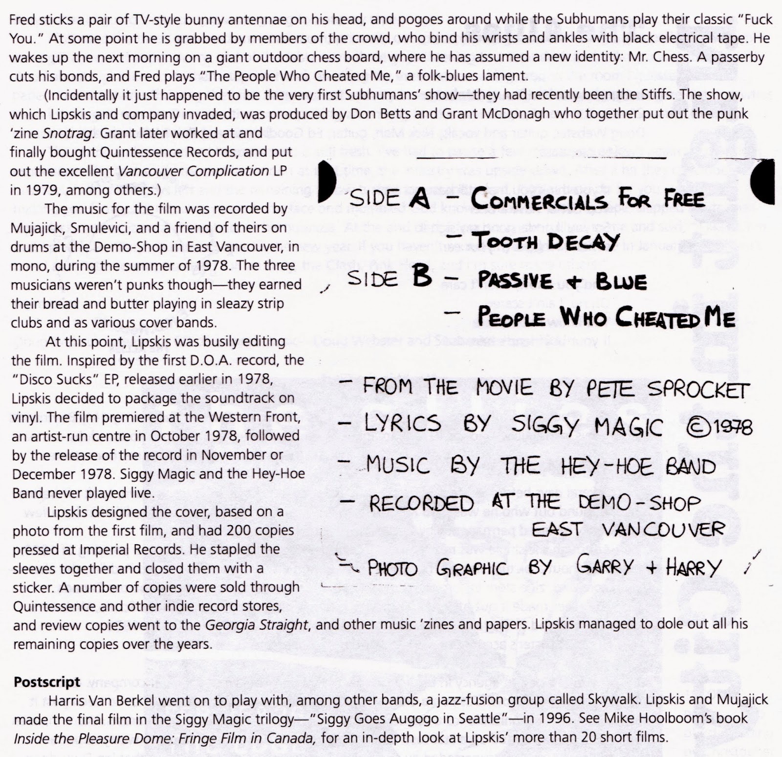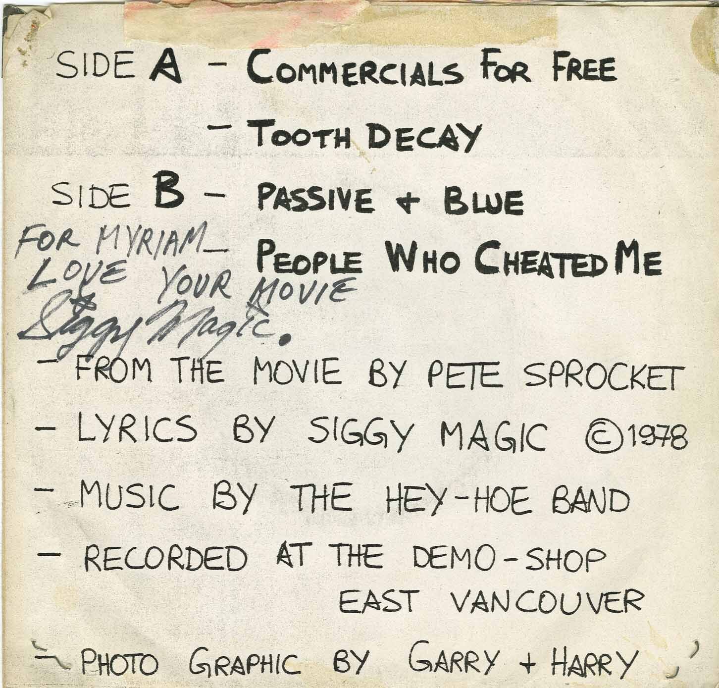 "Siggy Magic and the Hey-Hoe Band - Commercials for Free EP (Own, 1978). A country whose contributions to the punk vernacular rarely extend beyond tepid pop excursions or the substandard aping of their southerly neighbors. Now, now, before any Canadian aficionados feel unduly provoked and start spouting lines like “Hasn’t this asshole ever heard of the Neos, Dayglo Abortions, DOA, etc.?” let me lazily post the following disclaimer: The snare above is only in reference to the real never-weres—those bands or individuals whose records were pressed in the low hundreds and whose aspirations extended no further than their own vanity. It’s not my intention to undermine or denigrate this record’s musical superiority through qualifiers, but the reality that the UGLY sounds of the Hey-Hoe Band originate from the bucolic expanse of the Great White North is a decisive part of what makes the disc so remarkable. The fact that it’s a signature slab of strangulated roar / fortified grunt and strut, paralleled only by its closest philosophical compatriot—the first Snuky Tate EP—is of equal importance, too! The Commercials for Free EP, its tracks the proverbial lead-pipe cinch for inclusion on KBD #9 or #10, ended up on the last installment of Smash the State instead and was effectively lost to a wider audience. In a better world, this 45’s reputation would linger on the trembling lips of record collecting mama’s boys and forum trolls the world over. Not surprisingly, both Siggy and his EP were concepts that hatched and expired within the confines of the studio. The single, issued in an edition of 200 copies, features four songs; each tune corresponding to a specific act within a film of the same name. Chronicling the sojourn from yokel to punker, the record’s only dud, The People Who Cheated Me, was intended for the film’s denouement and expressed Siggy’s ultimate disenchantment with his newfound lifestyle. Poor Siggy."