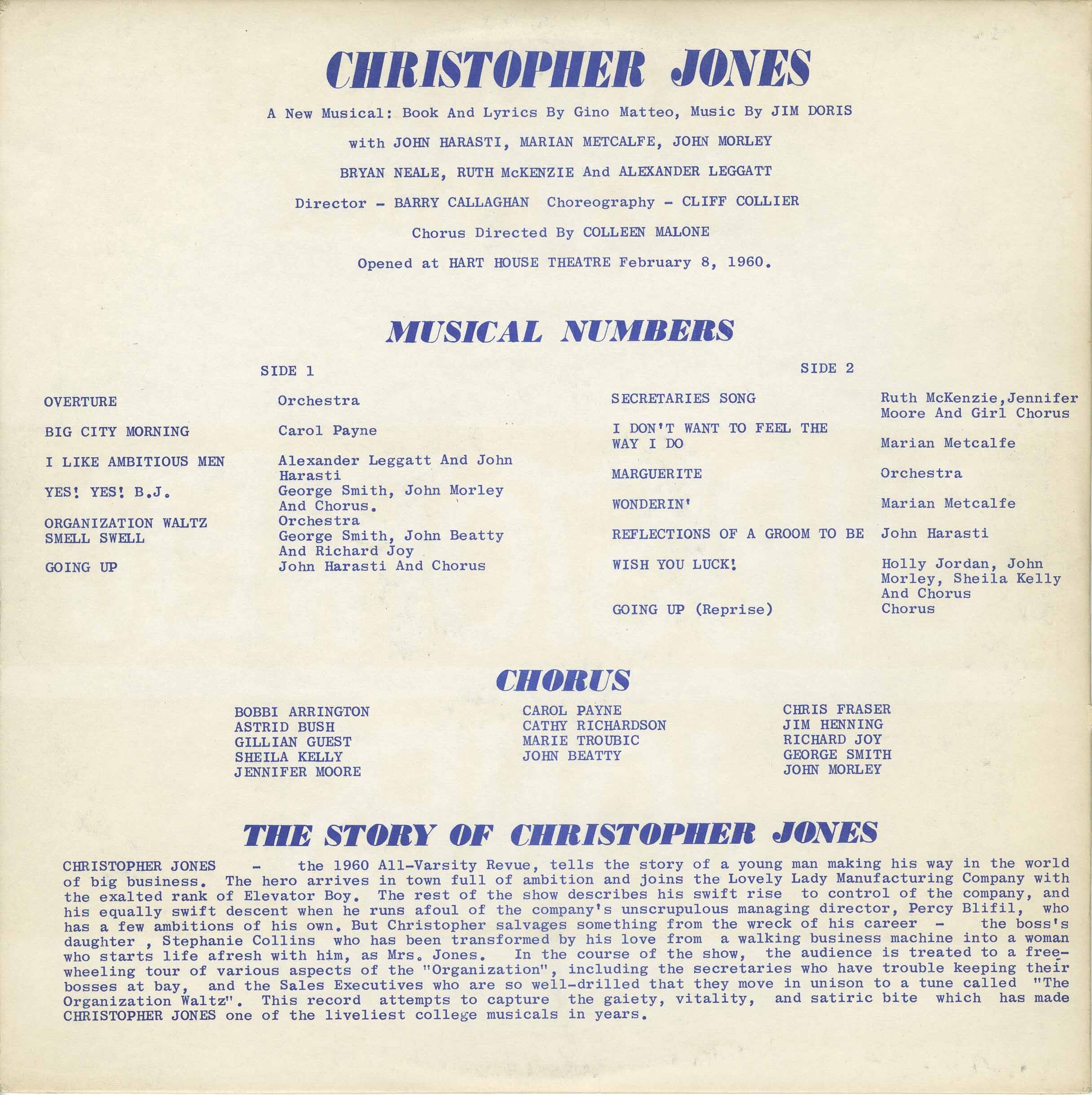 "The 1960 All-Varsity Musical tells the story of a young man making his way in the world of big business. The hero arrives in town full of ambition and joins the Lovely Lady Manufacturing Company with the exalted rank of Elevator Boy.The rest of the show describes his swift rise to control of the company, and his equally swift descent when he runs afoul of the company's unscrupulous managing director, Percy Blifil, who has a few ambitions of his own. But Christopher salvages something from the wreck of his career - the bosses daughter,Stephanie Collins, who has been transformed by his love from a walking business machine into a woman who starts life afresh with him,as Mrs. Jones. In the course of the show, the audience is treated to a free-wheeling tour of various aspects of the "Organization", including the secretaries who have trouble keeping their bosses at bay, and the Sales Executives who are so well drilled that they move in unison to a tune called "The Organization Waltz". This record attempts to capture the gaiety, vitality, and satiric bite which has made "CHIRSTOPHER JONES" one of the liveliest college musicals in years."
