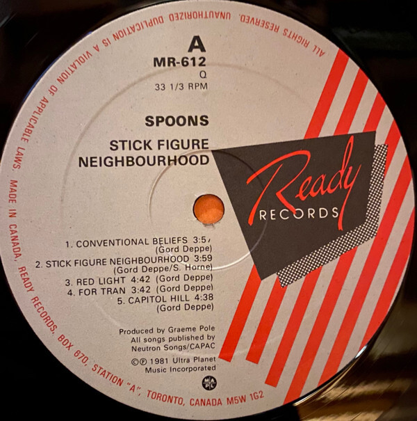 Stick Figure Neighbourhood was the first album by the Burlington band Spoons. Released in 1981, it received some airplay on college stations, particularly the songs Conventional Beliefs and Red Light. It was their next album, Arias & Symphonies, and its best known single, "Nova Heart", that were to launch them to fame. Not quite a frenetic and freaky as that wild first 45, this LP is also worth investigating. Lots of nice stripped down synth sound, none of the lush commercial sound that was to come on their next LP.