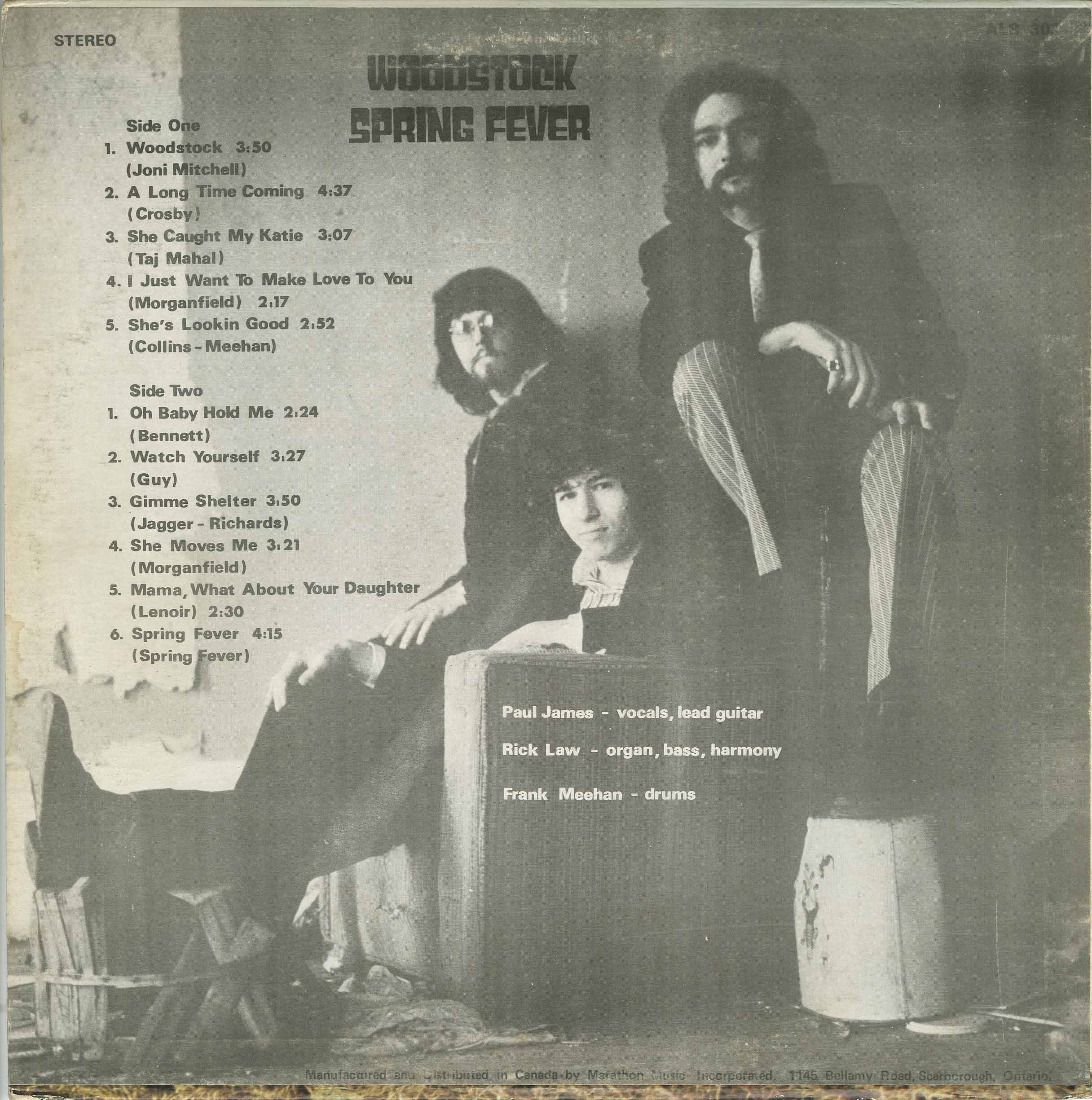 Spring Fever was a garage-charged Canadian power trio from Toronto, Ontario, who emerged in 1970 with a rare and now highly collectible LP titled Woodstock on Paragon Records. Featuring Paul James on vocals and guitar, Rick Law on bass and Hammond organ, and Frank Meehan on drums, the group delivered gritty, soulful covers of tracks by Joni Mitchell, David Crosby, Taj Mahal, Muddy Waters, Buddy Guy, The Rolling Stones, and others—captured with crisp, straightforward production that spotlights their tight musicianship over studio excess.