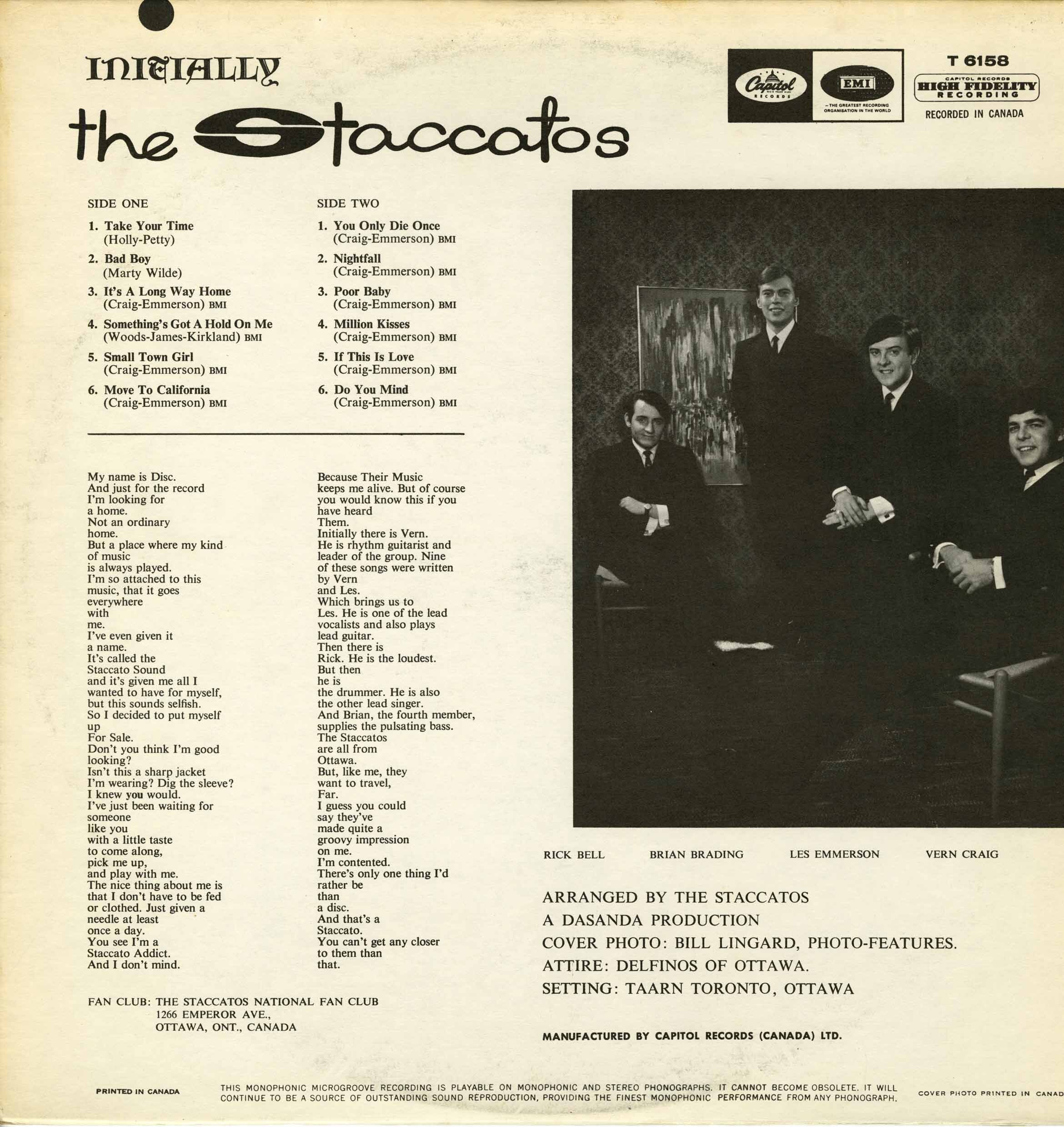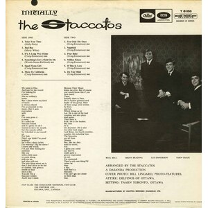 Before the Five Man Electrical Band, there was the Staccatos - the first sparks of a fantastic band with great vocals, and a great songwriter, Les Emmerson-then paired with with early Staccatos member Vern Craig-who wrote most of their tunes together with Les. After Signing with Capitol records, The Staccatos began to score many local successful singles in the Ottawa Area. "Small Town Girl, "Move To California", "It's A Long Way Home", "Poor Baby", "Do You Mind" - all of which are contained on this album, along with several other originals like "Nightfall", "Something's Got A Hold On Me", "If This Is Love". Along with covers like "Take Your Time" & "Bad Boy" Recorded in a very short period of time, the Staccatos managed to pull off a winner. With jangly guitars, uptempo rhythms and music to keep you moving. Certainly not your typical debut album from a 60's band. This album features the ultra rare first pressing high gloss laminated front cover. Dean Hagopian (vocals; 1963-64) Brian Rading (bass) Rick 'Bell' Belanger (drums) Les Emmerson (vocals, guitar) Vern Craig (guitar; 1963-68) Mike 'Bell' Belanger (2nd drums; 1968-73) Ted Gerow (keyboards; 1968-73)