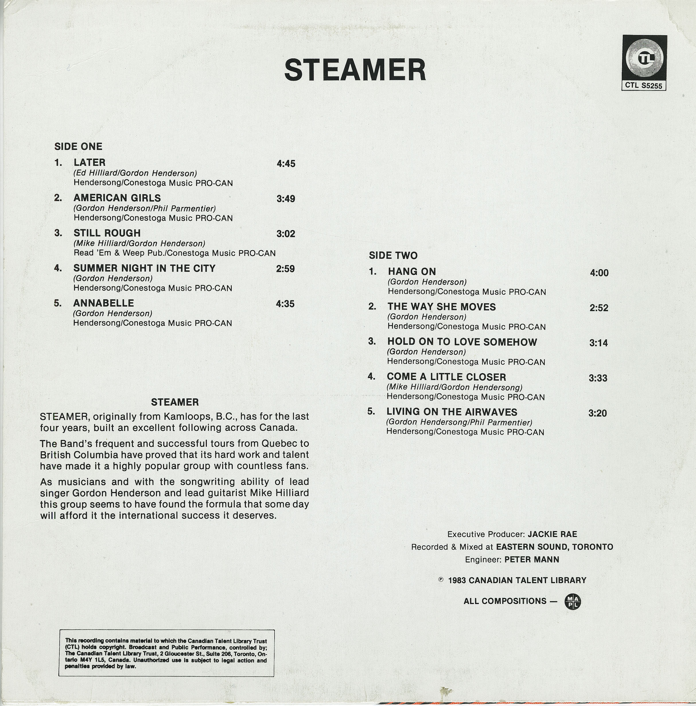 Steamer started playing more in the Lower Mainland, but their path to success led eastward, where they had to rebuild their reputation on the southern Ontario bar circuit. They released three albums, Look At Me Now (1980), a self-titled album in 1982 after signing with RCA, and Steamer Part Two in 1983. They toured as far afield as South Korea. After eight years, Steamer sailed home in 1984.