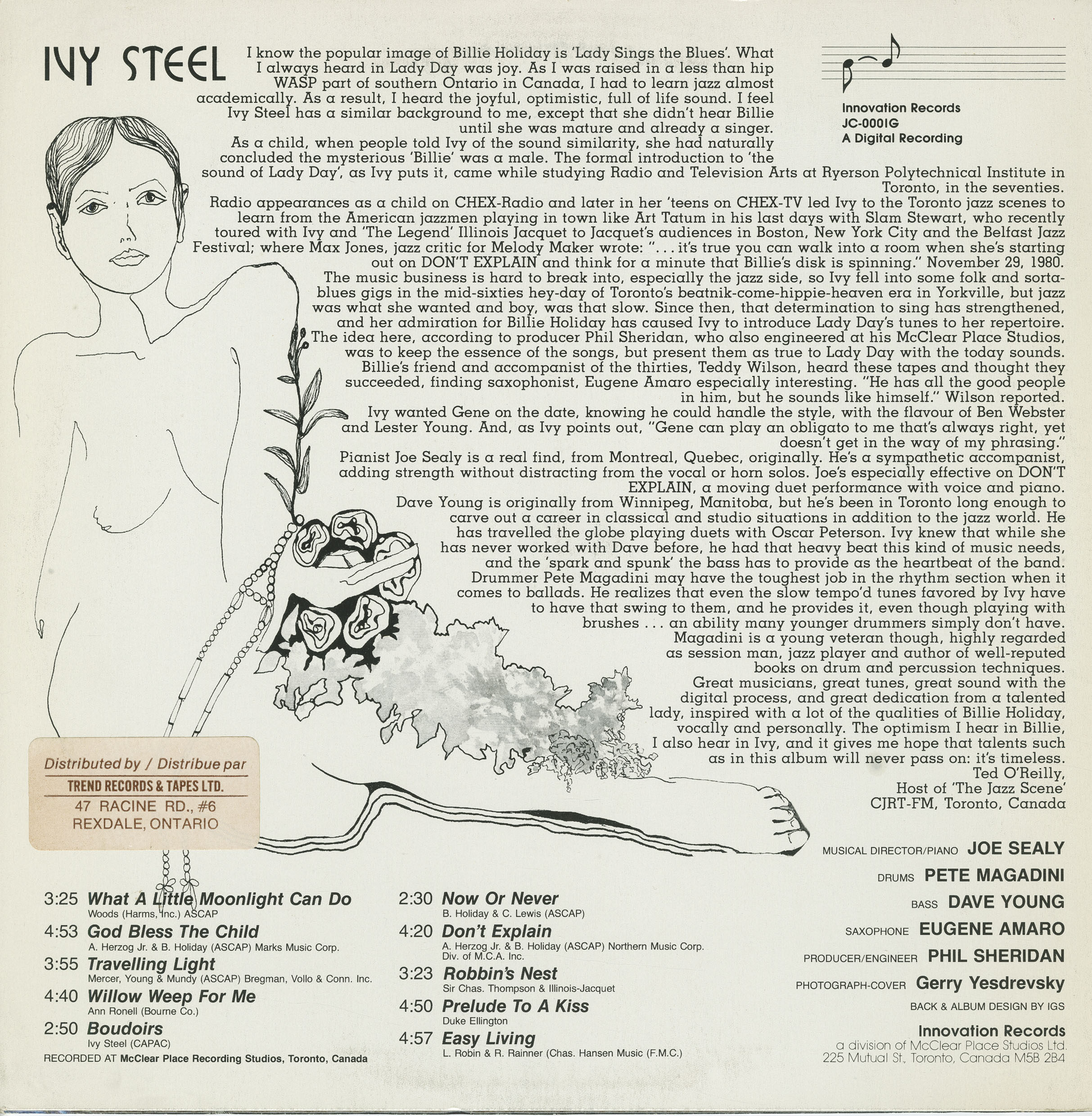 In 1981, Steel recorded her sole known album, Reincarnation, at McClear Place Studios for Innovation Records. Produced by Phil Sheridan, the album’s concept was to introduce Billie Holiday’s muse to Steel’s repertoire, preserving the emotional depth of Lady Day’s work while updating the sound for a modern setting. The record featured a first-class Canadian jazz lineup: Joe Sealy (piano, musical director), Pete Magadini (drums), Dave Young (bass), and Eugene Amaro (saxophone). Steel’s program mixed classics like “God Bless the Child,” “Willow Weep for Me,” and “Don’t Explain” with lesser-known standards and her own composition, “Boudoirs.”