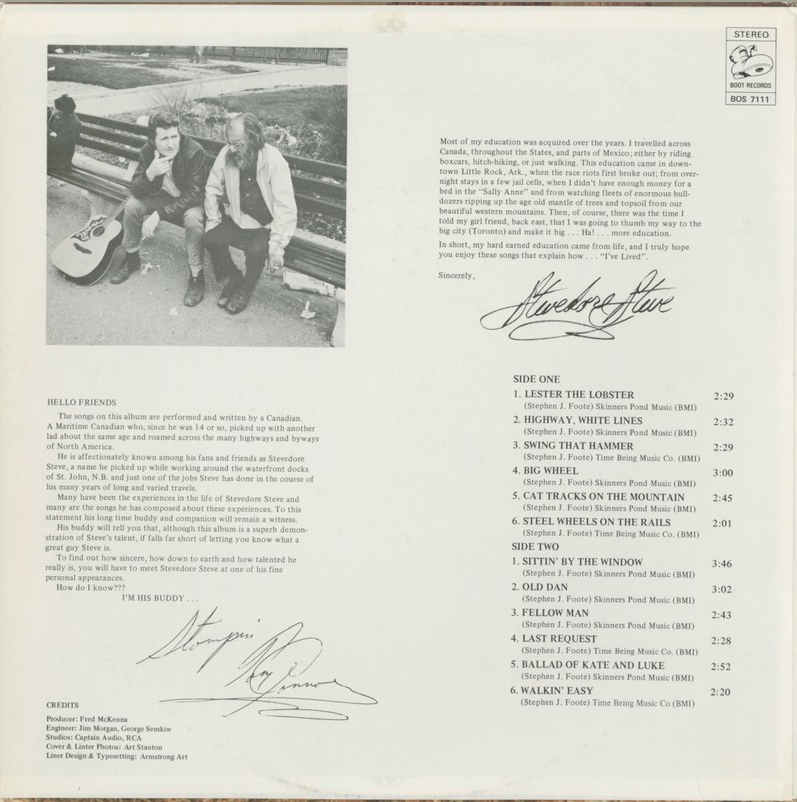 Many have been the experiences in the live of Stevedore Steve and many are the songs he has composed about these experiences. To this statement his long time buddy and companion will remain a witness.