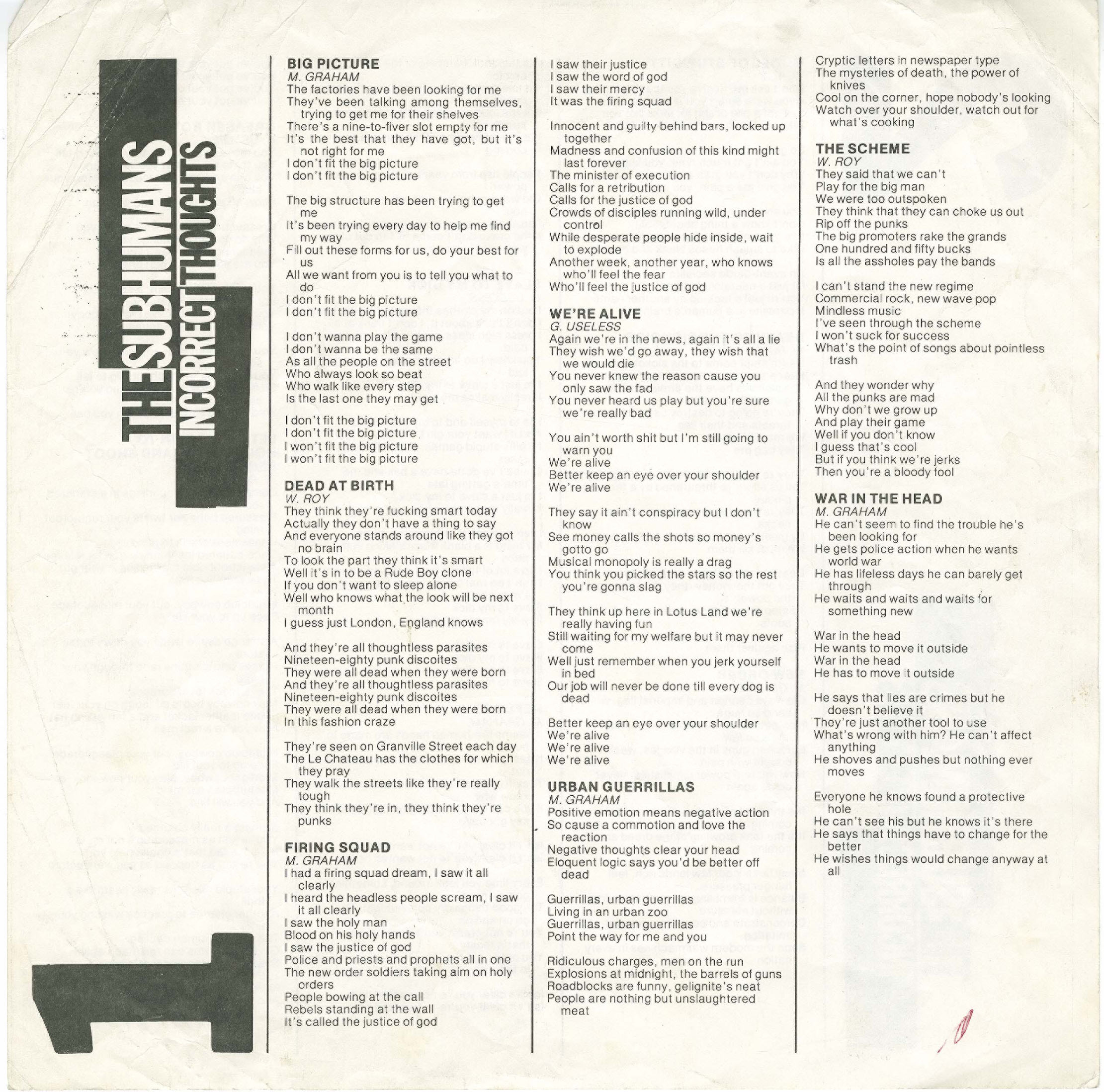 Opening with the snarling “You’re A Target,” the record wastes no time in establishing its agenda: confrontational, intelligent, and completely unfiltered. From the bleak realism of “Dead at Birth” to the seething critique of militarism in “Firing Squad,” Incorrect Thoughts is a guided tour through the anxieties of a generation raised under Cold War paranoia and consumerist rot.