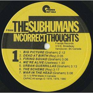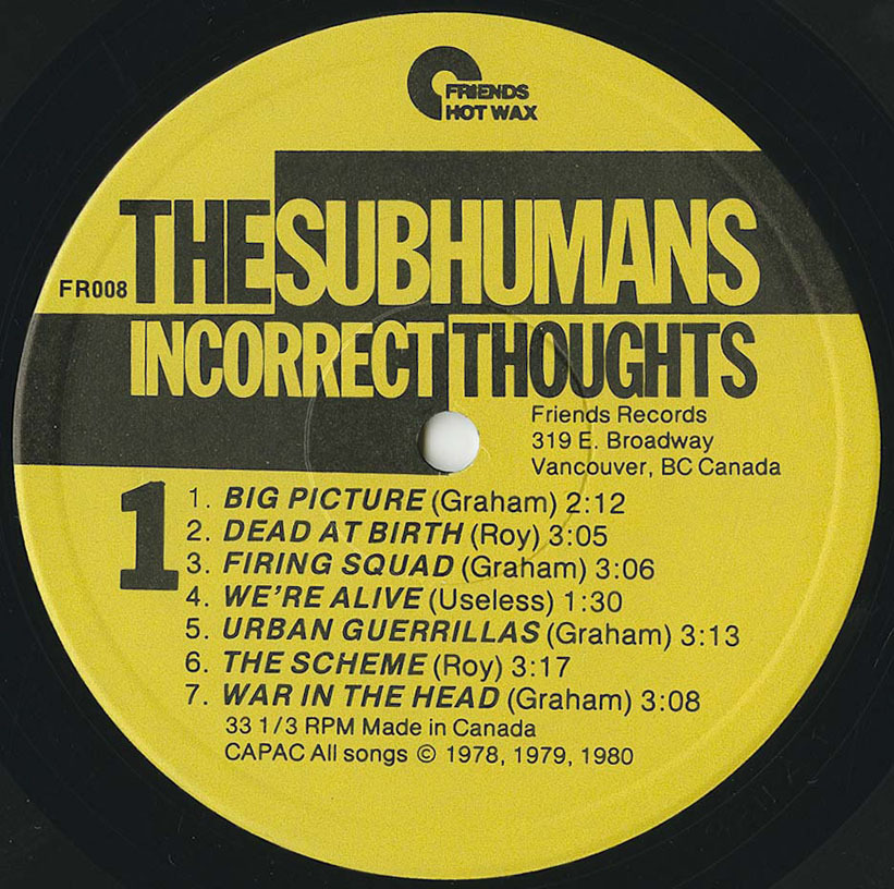 Originally issued on Vancouver’s Friends Records, Incorrect Thoughts later found wider distribution through Black Flag’s SST label—one of the few Canadian punk records of the era to make transnational waves. Legal disputes around the original master would later prompt the band to re-record the entire album as Same Thoughts, Different Day in 2010.