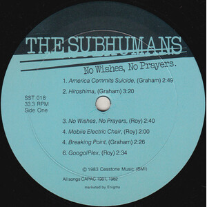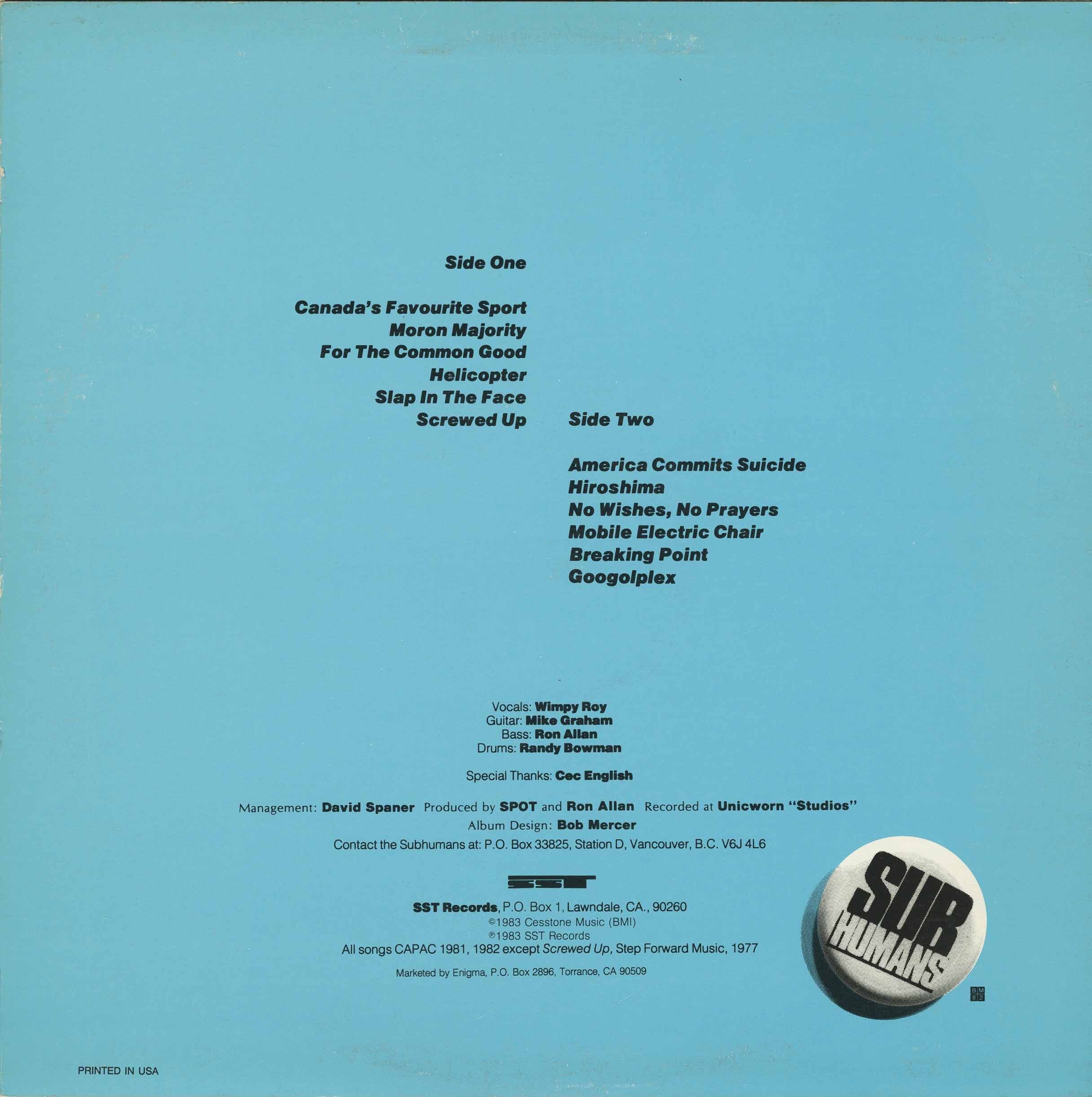 “Time has been kind to the Subhumans’ music — it sounds as fresh and invigorating as the day it was cut. The political sentiments are as valid today as they were in 1979 or ’80. The Subhumans are still pissed off — and with good reason.”