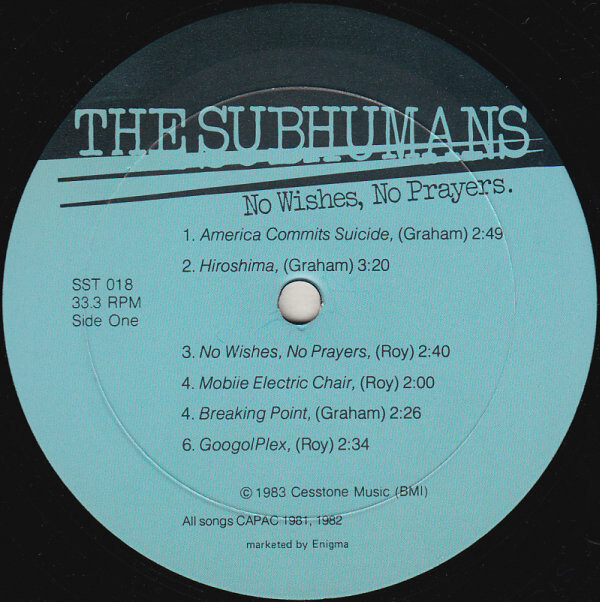 But by 1981, internal exhaustion and political disillusionment began to fracture the group. Following a grueling tour, both Gerry Hannah and Jim Imagawa (who had replaced Dimwit on drums) exited. Ron Allan (bass) and Randy Bowman (drums) joined for one final studio effort, No Wishes, No Prayers, recorded for SST Records. Before the album’s release, Brian Goble left to join D.O.A., and Mike Graham went on to form Shanghai Dog. The Subhumans were, officially, no more.