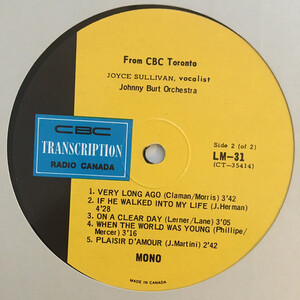 In 1965, she released her first solo LP, The Songs of Joyce Sullivan, on the Canadian Talent Library (CTL). The album featured twelve of her favorite romantic ballads, arranged and conducted by Johnny Burt, Pat Riccio, and Wally Wicken. Each brought a distinct orchestral style—from Burt’s lush mood arrangements to Wicken’s show-tune flair—while Sullivan’s vocal performances displayed emotional range and technical finesse. Tracks like “Speak Low,” “Say It Isn’t So,” and “You’ll Never Know” showcased her ability to move seamlessly between jazz-inflected torch songs and more intimate pop standards.