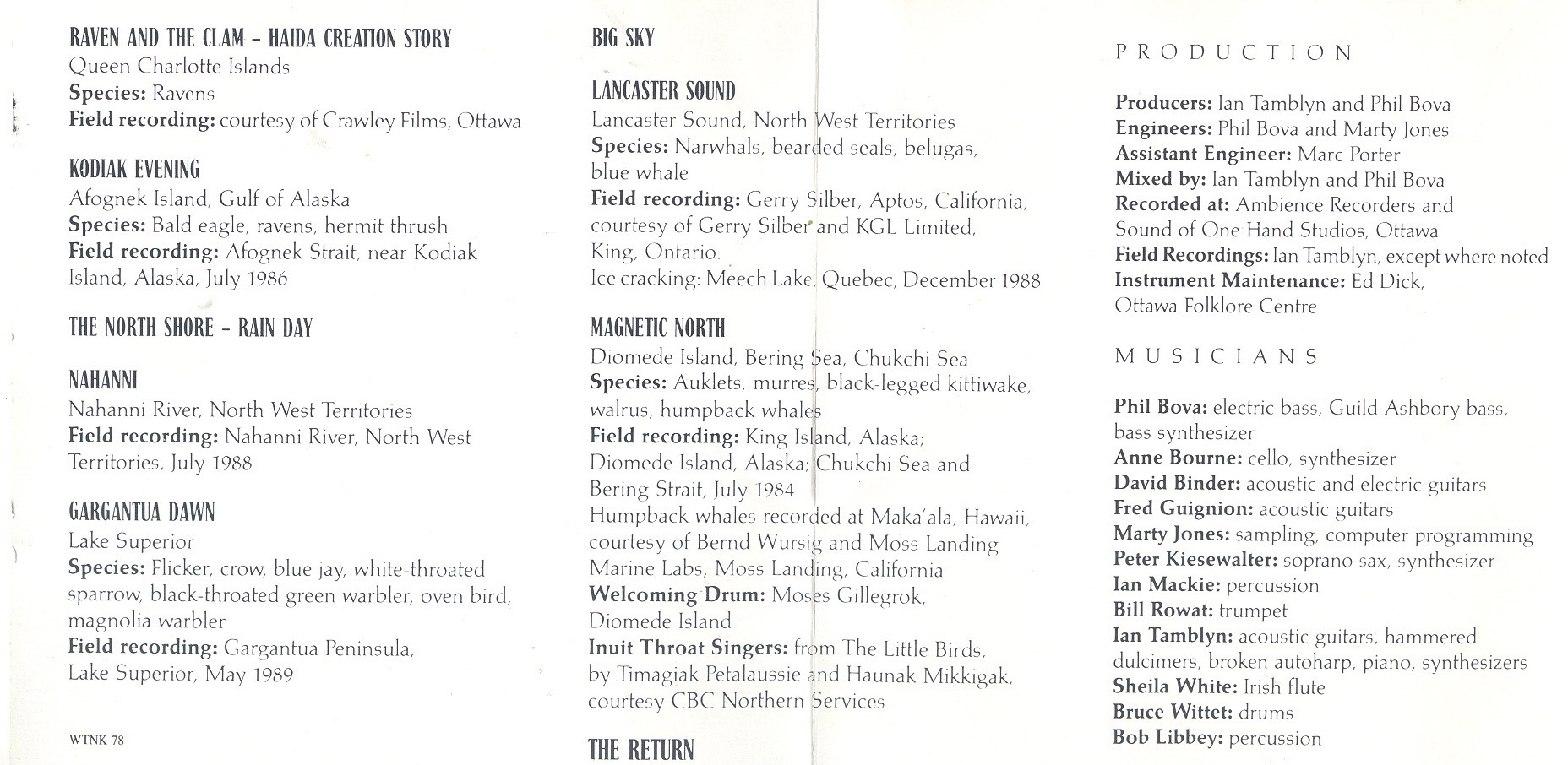 This collection of instrumental music blended with environmental sounds began with my fascination with the north shore of Lake Superior in the early seventies. I became interested in exploring the concept of a spiritual north perhaps in a similar vein as Glenn Gould's "Idea of North" series he did for the CBC, except I hadn't heard of Glenn Gould's series until much later. In 1984 I was invited north as a writer in residence on a scientific trip to the Chuckchi Sea, north of the Bering Strait, to study he feeding habits of whales and walrus. The experience changed my life and when I returned I commenced this project. It was five years in the making. In the interim, Over My Head and Ghost Parade were released. I was doing a lot of theatre soundtrack music then and enjoyed writing pieces where the mood was less deterministic than a verbal piece and yet still told a story. Pieces on this album range from the Nahanni River, Kodiak Island, Haida Gwaii, Lake Superior, Lancaster Sound and Chukchi Sea. Nominated for Juno for Best Instrumental Album, 1990, this most Canadian of albums was refused Canada Council funding for being supported by American scientists. I have never sought Council funding since that time. The multi-discipline world of science and arts had been tremendously rewarding, and I am forever grateful to Dr. John Oliver of Moss Landing Marine Labs, Moss Landing California for the opportunities he gave me.