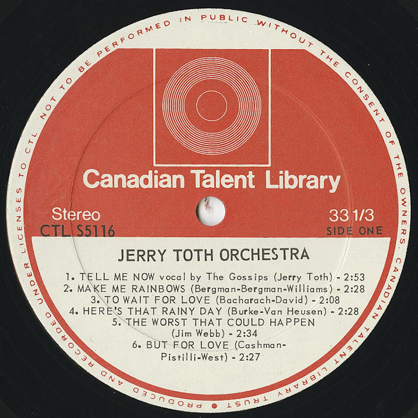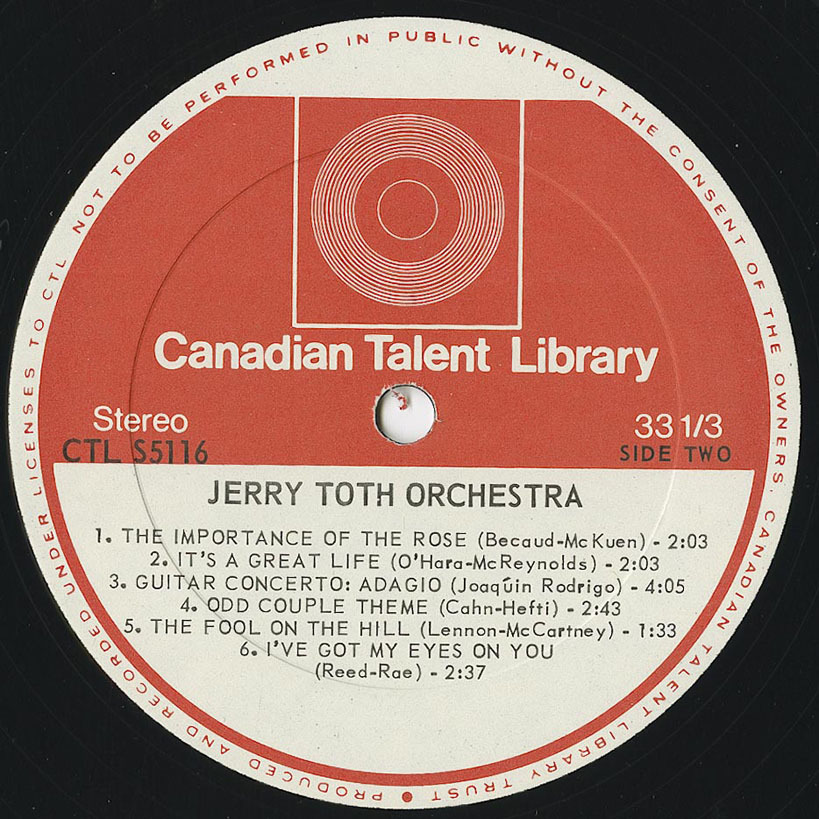 In 1969, the picture was more clear and beautiful. Here was Jerry Toth, the man of music, and during the course of one long studio session, surrounded by twenty-five of Canada’s finest musicians, participating in another Canadian Talent Library LP production of the music he loves. With selections drawn from the pop, jazz, vocal and classical music world – and several of Jerry Toth’s own compositions – the result is this present album, THE MUSIC OF JERRY TOTH.