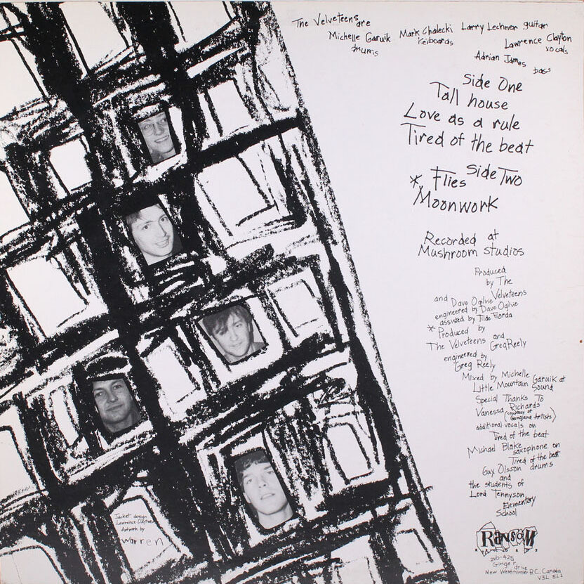 Like many independent Vancouver-based bands, The Velveteens are feeling optimistic thanks to the signing of Vancouver's 54-40 to the Reprise label out of Los Angeles. "It's encouraging because if one former independent Vancouver band can get some recognition, it can't help but shine a light on the other groups," says Clayton.
