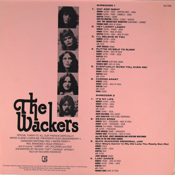 Although the Wackers had formed in Northern California, they moved to Montreal after recording most of their second album, 1972's Hot Wacks, in the city, returning to play an enthusiastically received two-month residency at the Mustache club. Shredder started out not as a Wackers album, but as a side project for Bob Segarini and Randy Bishop, who had done much of the writing and singing on the first two Wackers LPs. Calling themselves the Incredible Duck Brothers, they were joined in the recording by Wackers bassist-guitarist Bill "Kootch" Trochim. Segarini had studio time at Wally Heider's Studio in San Francisco, he explains, "and we went in and did some little acoustic things. There were three or four songs we did, sort of mellow stuff. Everybody was enjoying this." After getting a go-ahead from Elektra president and founder Jac Holzman to do a full album, he continues, "I said, 'I want to go back to Montreal and finish this.' At the end, Elektra was so knocked out by the songs they flew [Wackers drummer] Ernie [Earnshaw] up, and we finished the album as the Wackers. So, so much for the Duck Brothers. But that's why it really leans back to the acoustic days, 'cause that's how it started out."