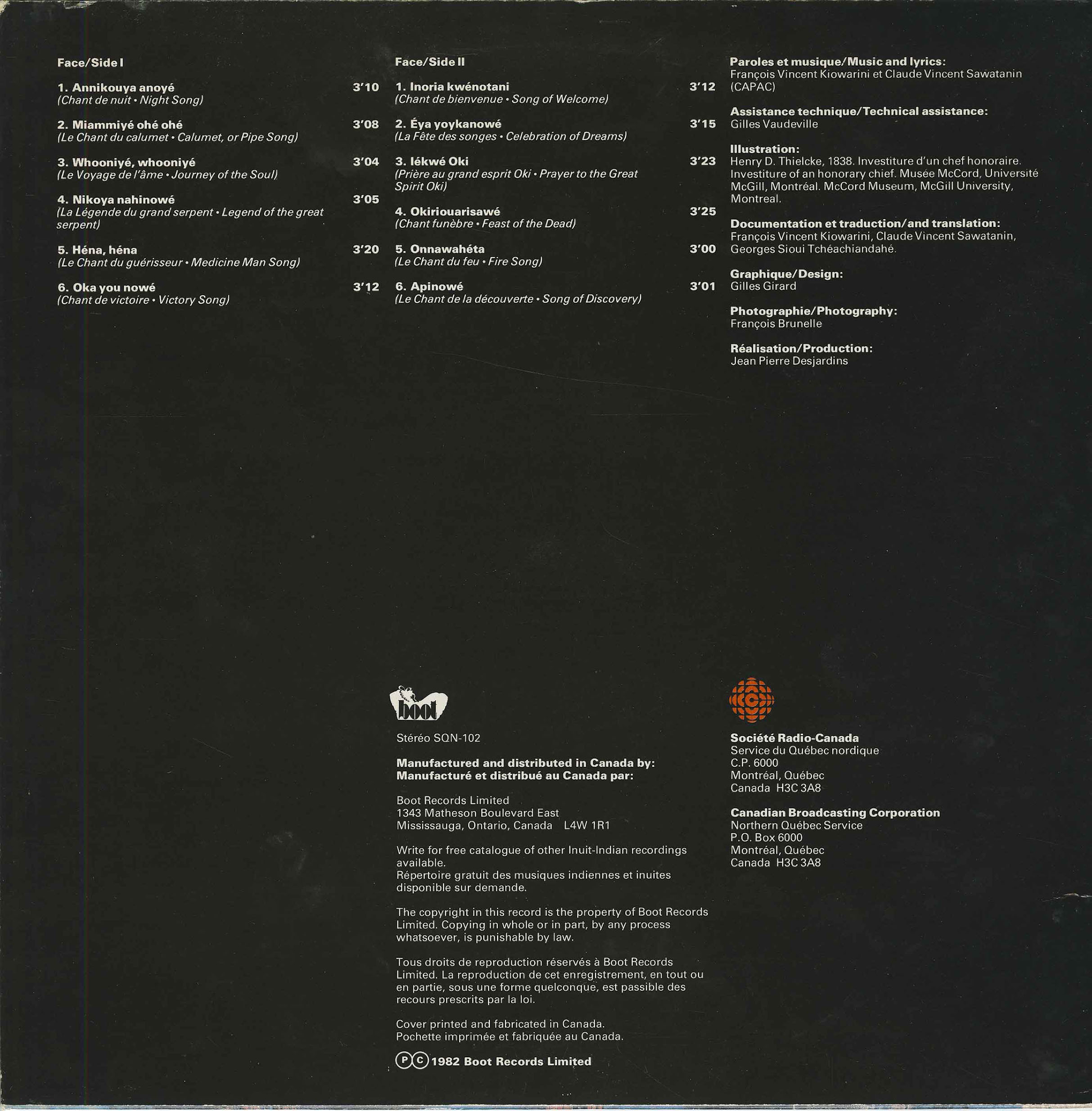 In his wisdom, Kiowarini, along with his artist brother Claude, made recordings to preserve the sound and songs of their people. In his later years, Kiowarini made great efforts, even while gravely ill, to record his work for the benefit of future generations. He had made a first vinyl record in the 1970's and by 2009, he had completed four CDs. One of his most significant compositions was “La Huronne” which has become the nation’s anthem.