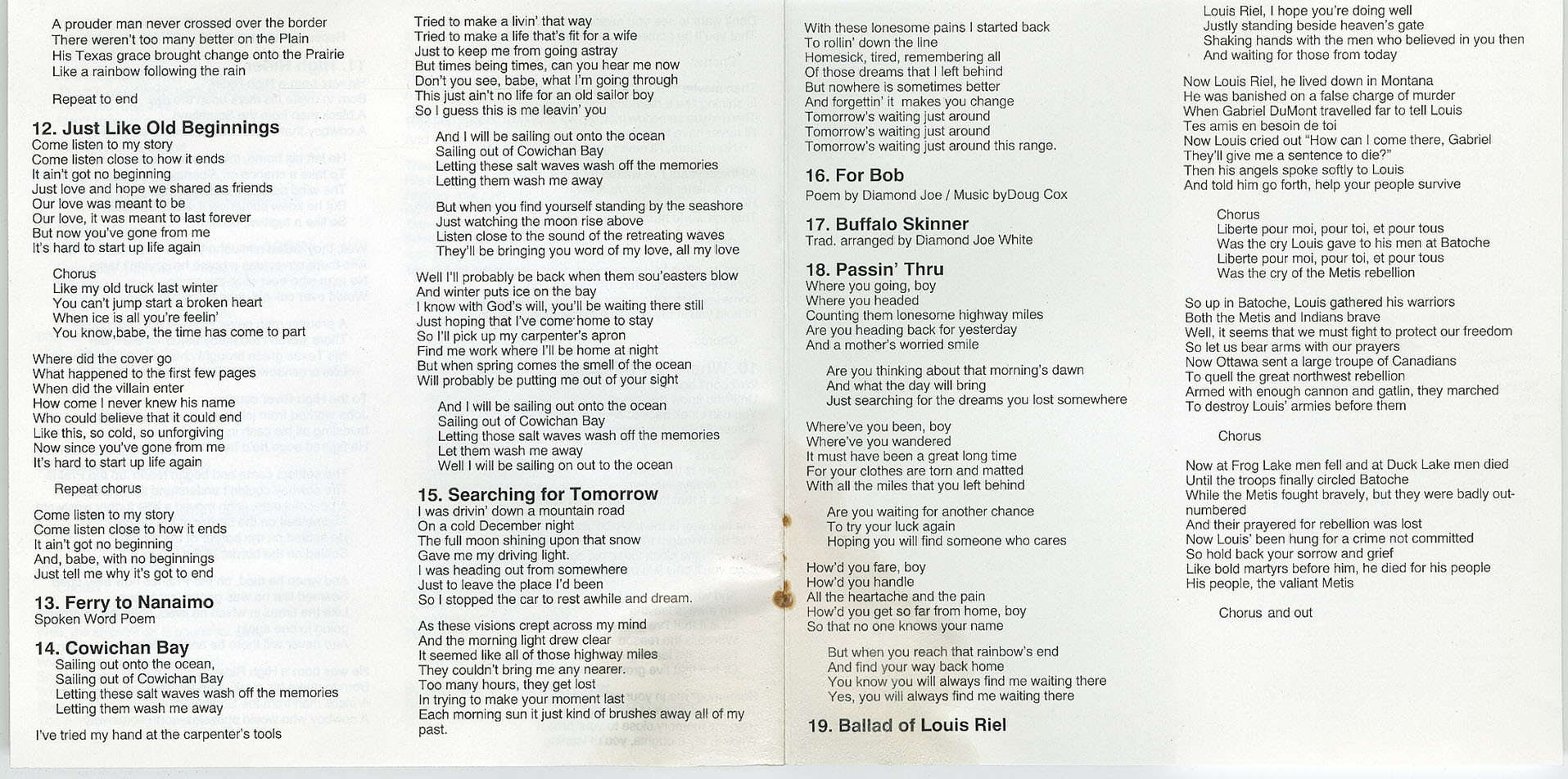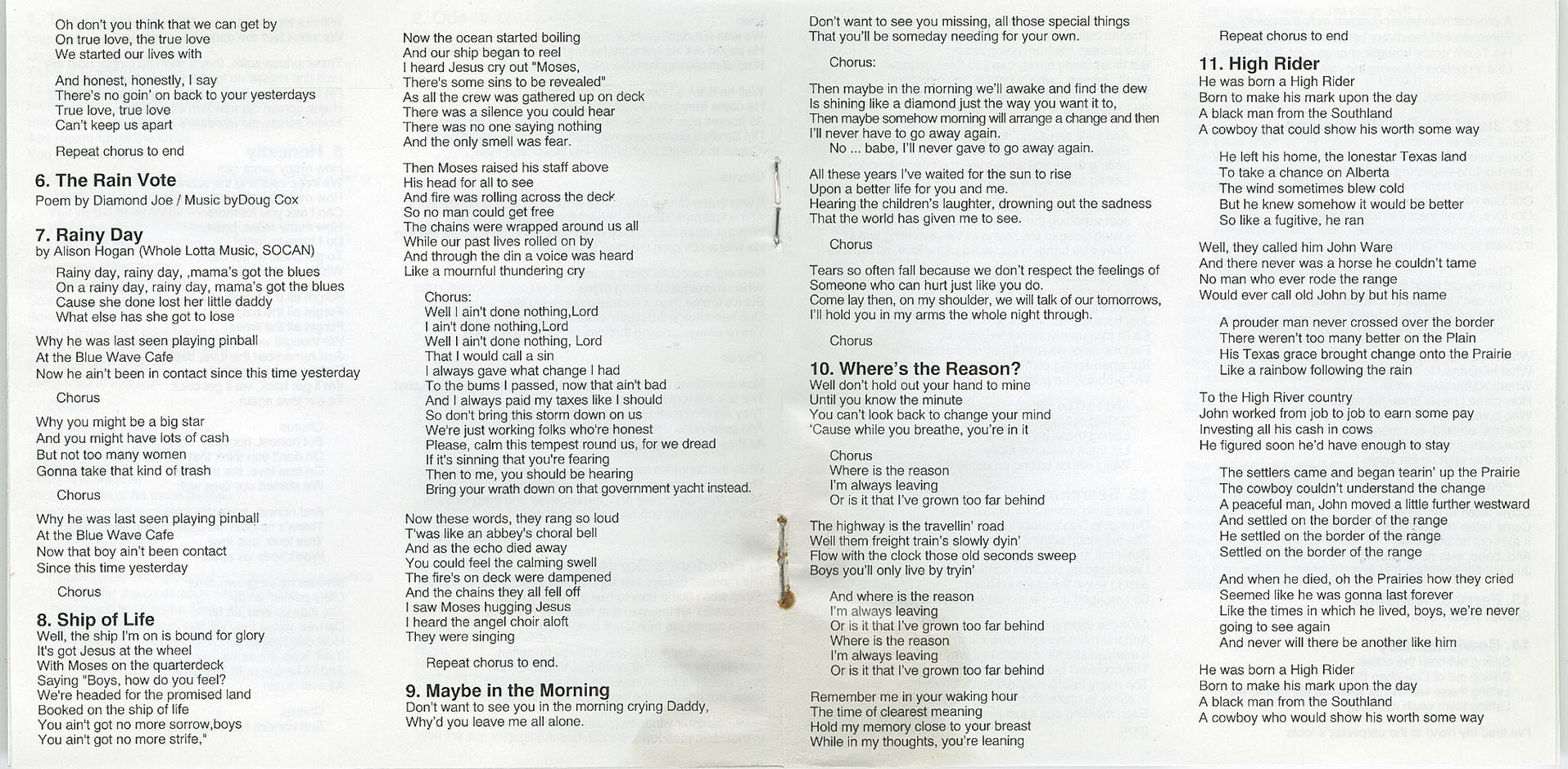 All songs and poems by Diamond Joe White (Shortgrass Music) unless otherwise noted.