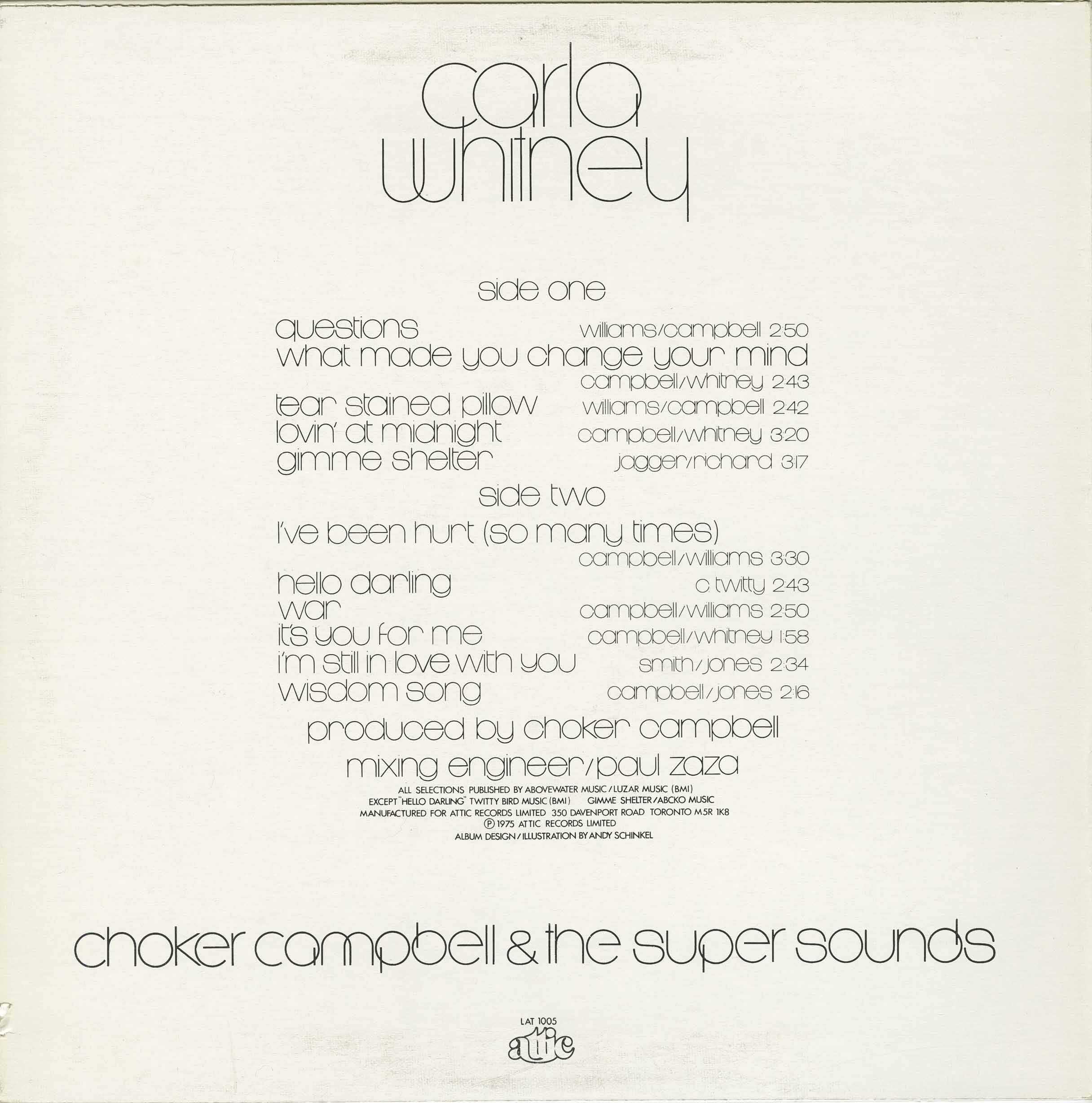 Carla Whitney remains one of Canada’s most intriguing and mysterious soul voices. Emerging from Toronto in the mid‑1970s, she is best known for her singular recording—Carla Whitney (with Choker Campbell and the Super Sounds)—released in 1975 on Attic Records. Although her recorded output was brief, the album (along with its two singles, catalog numbers AT 117 and AT 113) has grown into a coveted collectible among soul, funk, and R&B enthusiasts.
