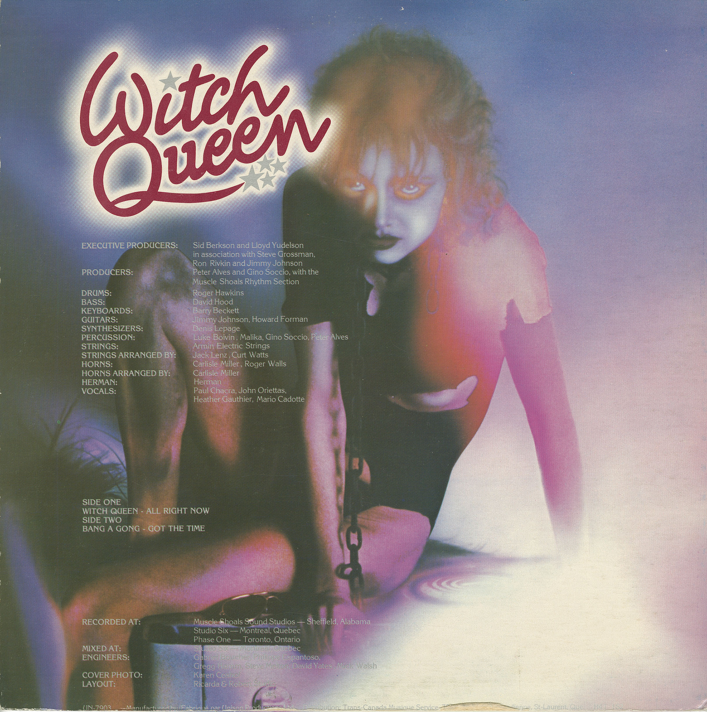In the fall of 1979, Witch Queen released a disco cover version of “All Right Now”, (a 1970 number-one hit by the UK rock band Free). Although it got a few months of airplay on CKLG in Vancouver, the song didn’t chart.
