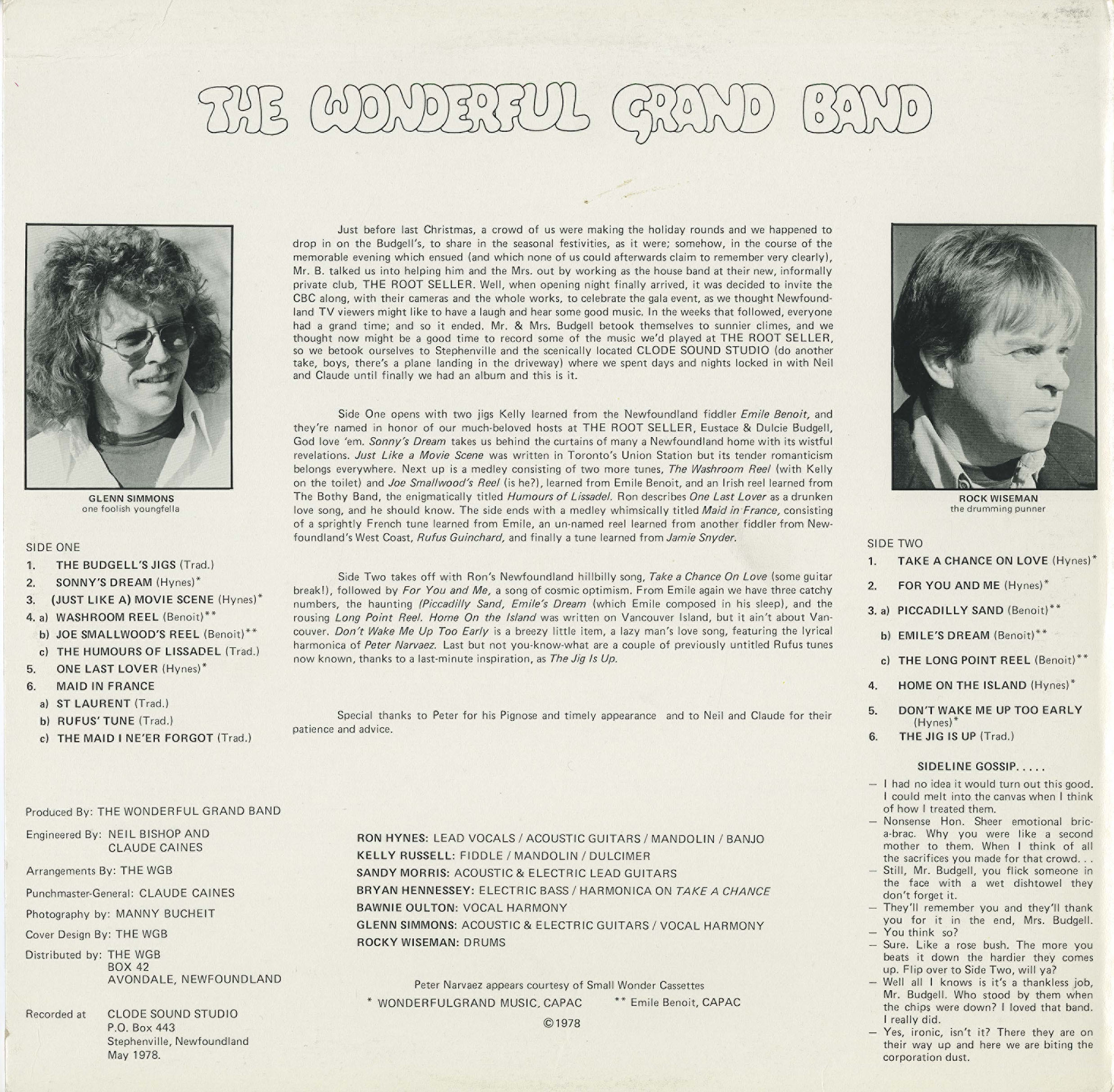 Mostly traditional Newfoundland music featuring Newfoundland's finest songwriter Ron Hynes, Glenn Simmons who later formed THE FABLES, Kelly Russell (once a member of Figgy Duff and The Plankerdown Band), Sandy Morris on guitar, Bryan Hennessey, and Rocky Wiseman on drums. The Wonderful Grand Band became one of Newfoundland's most popular acts, combining traditional and original songs with fresh musical ideas. The band spent six years touring, producing its own television series and recorded two albums. (2 albums never released outside Newf., led by Ron Hynes, often worked with satirists who later became the Codco troupe).