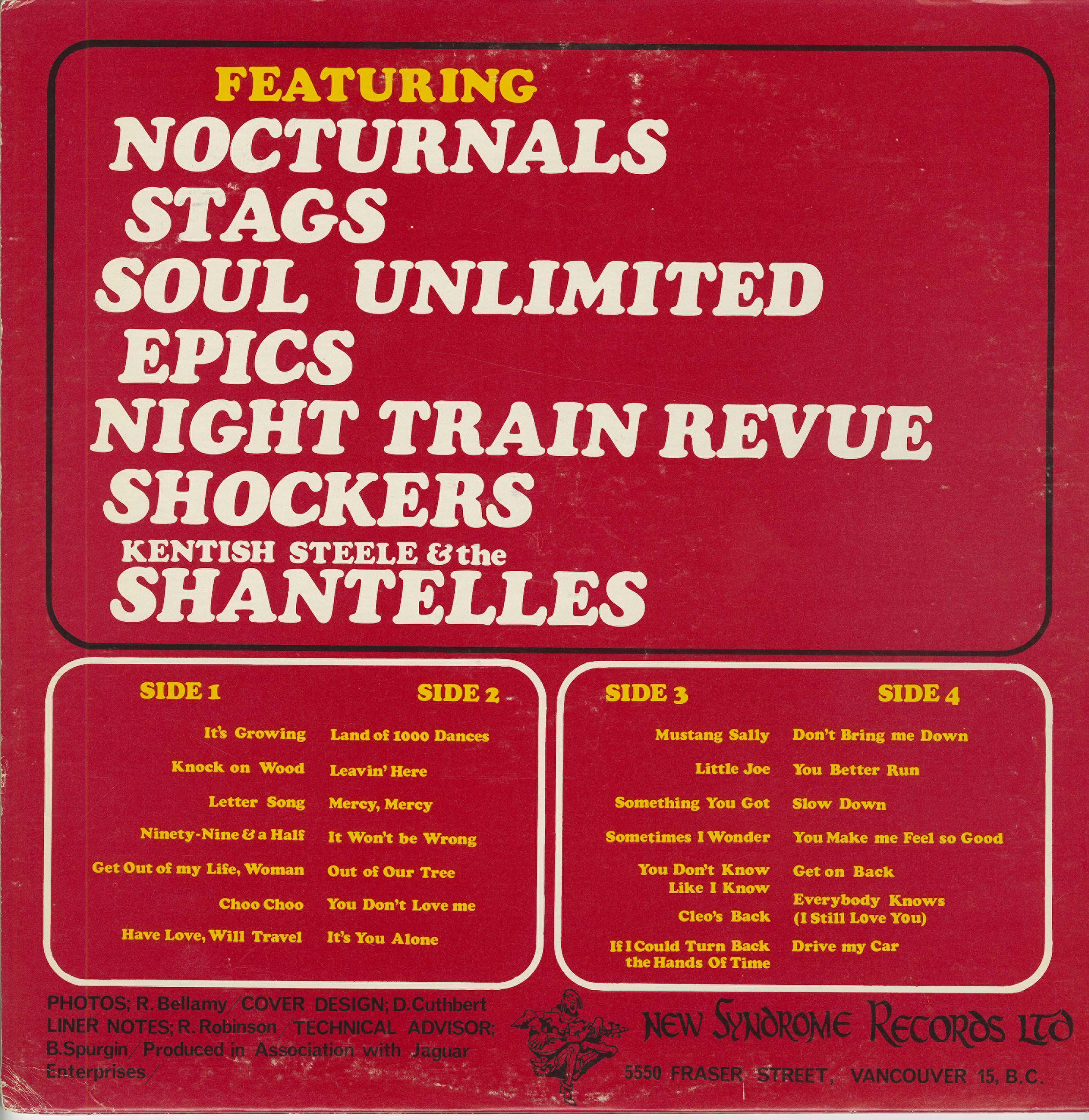 It's hard to believe that New Westminster could be the heart of the R&B Scene, but there it was, the mid 60's, and IKE AND TINA TURNER were on the bill! The former Hollywood Bowl, under new ownership of Les Vogt and the management of Douglas Miller, became the short lived Grooveyard, and took its rightful place in local music history. MARVIN GAYE, ETTA JAMES, LITTLE JUNIOR PARKER, THE SPINNERS, and BO DIDDLEY performed there, as well as hot Northwest groups THE KINGSMEN, PAUL REVERE AND THE RAIDERS, DON AND THE GOODTIMES, and even THE SONICS. Most importantly, The Grooveyard gave some of Vancouver's hottest acts a stage and, on some very special evenings, you could see up to ten live bands and dance 'til you dropped. It just didn't get any better. The original album was the brainchild of Les Vogt, band manager, concert promoter, rockabilly performer, and owner of the Grooveyard. He thought the album would generate more publicity for the club and the bands in his management stable. He took his idea to musician and song writer Tom Northcott and local entrepreneur Jack Herschorn at their offices, where they operated New Syndrome Records.