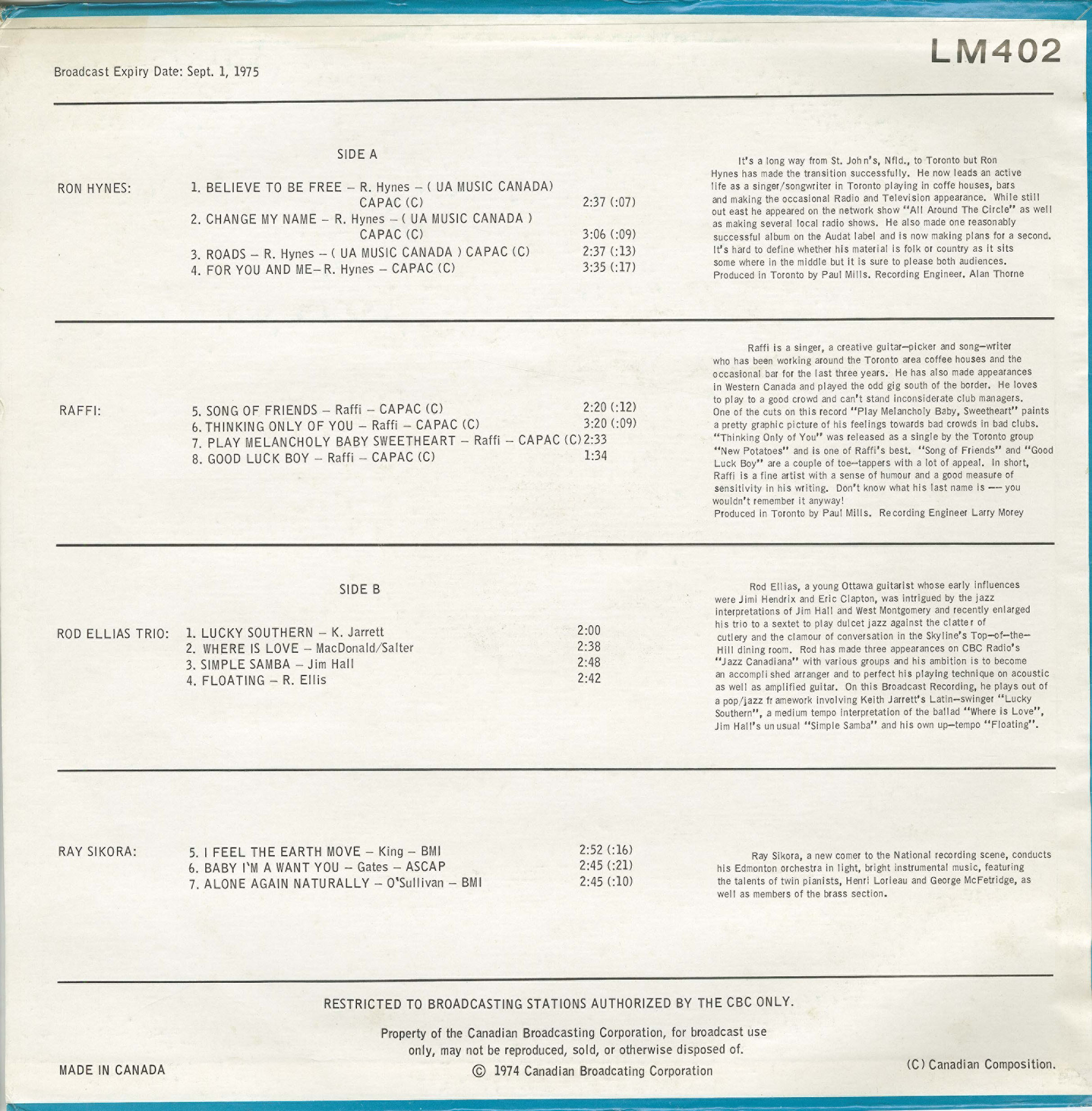 Jazz, Newfoundland Labrador, Ontario, CBC Radio Canada LM Series, Folk, British Columbia, 1970's
