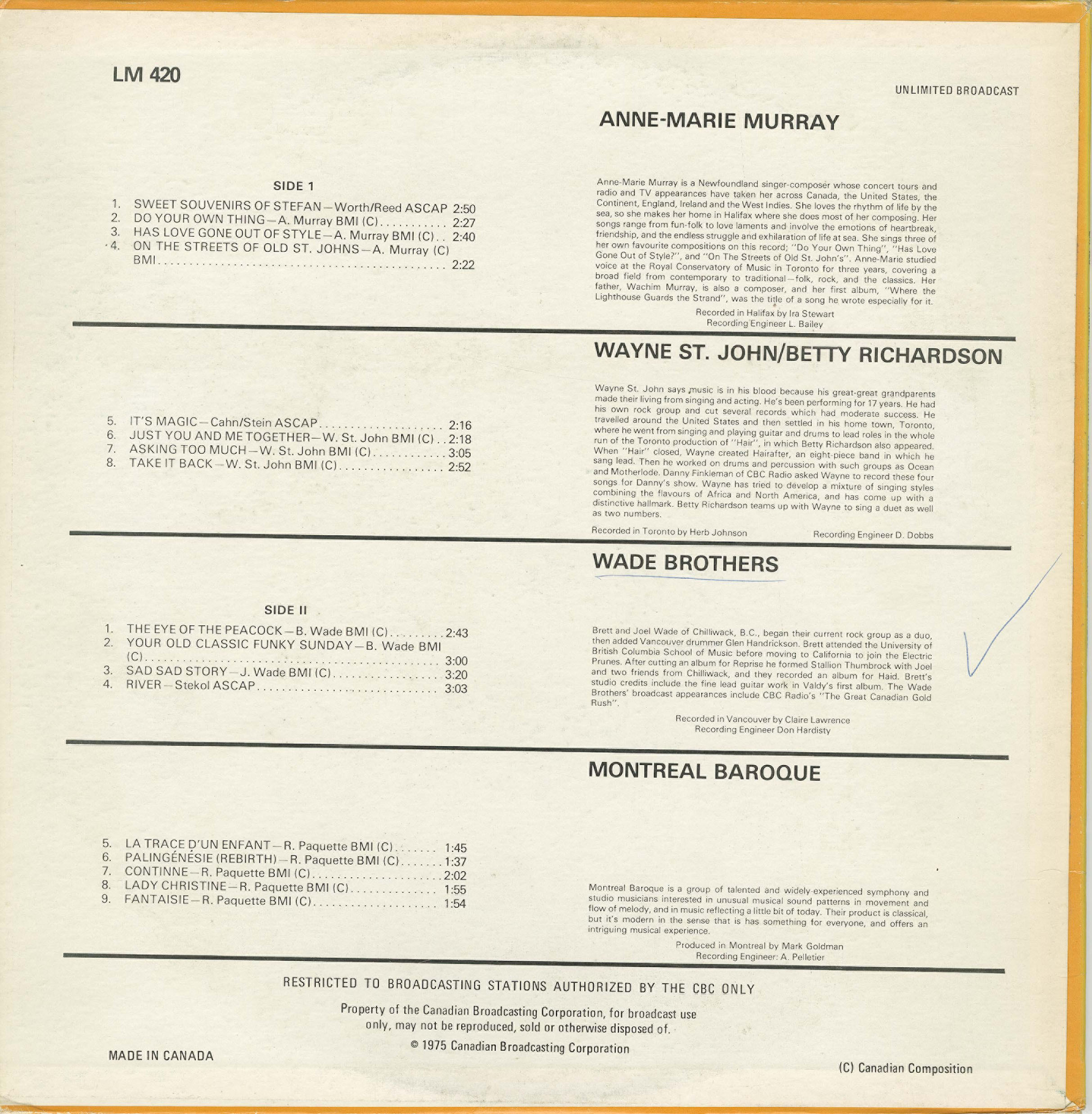 Recorded in Toronto by Herb Johnson