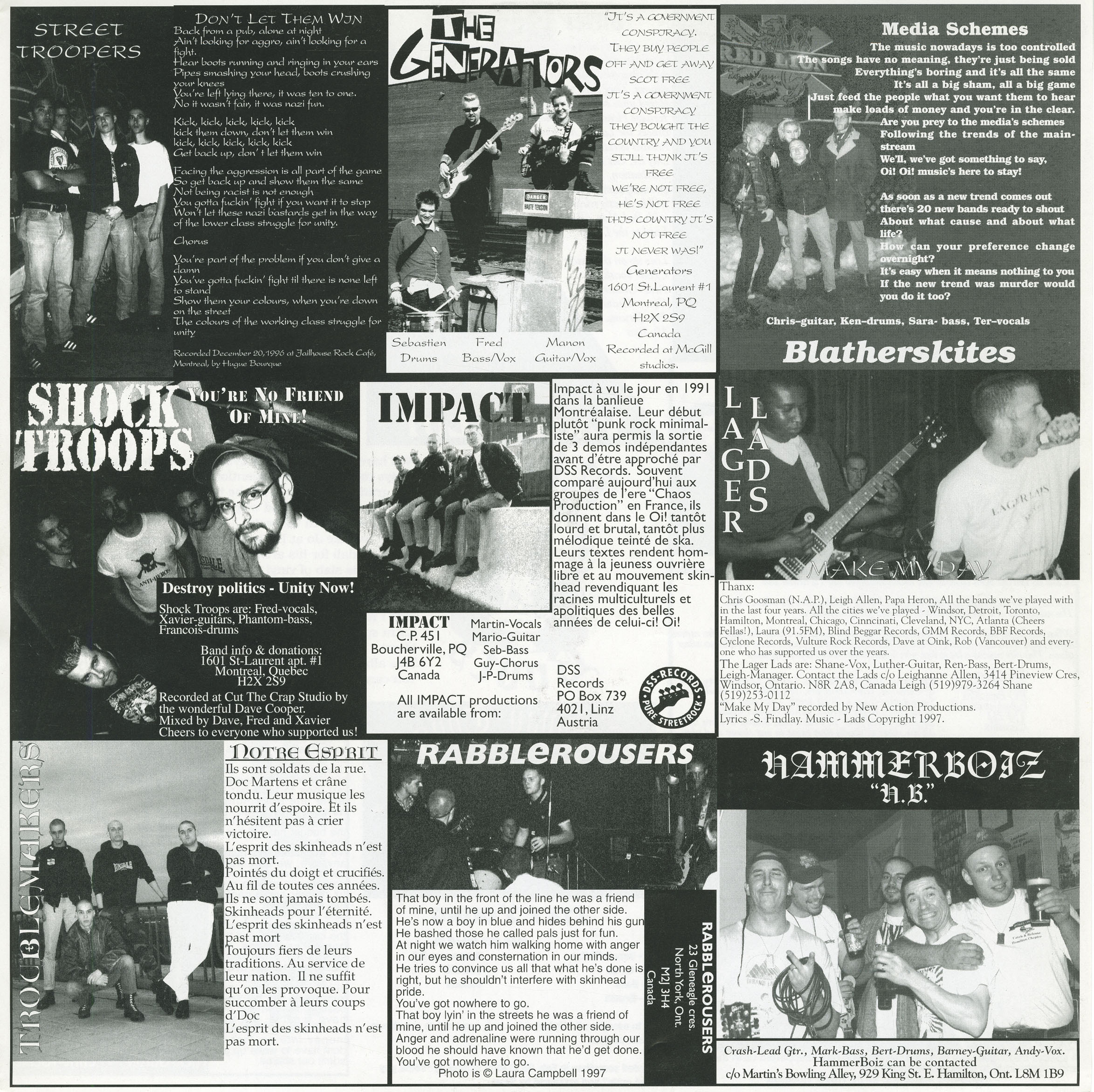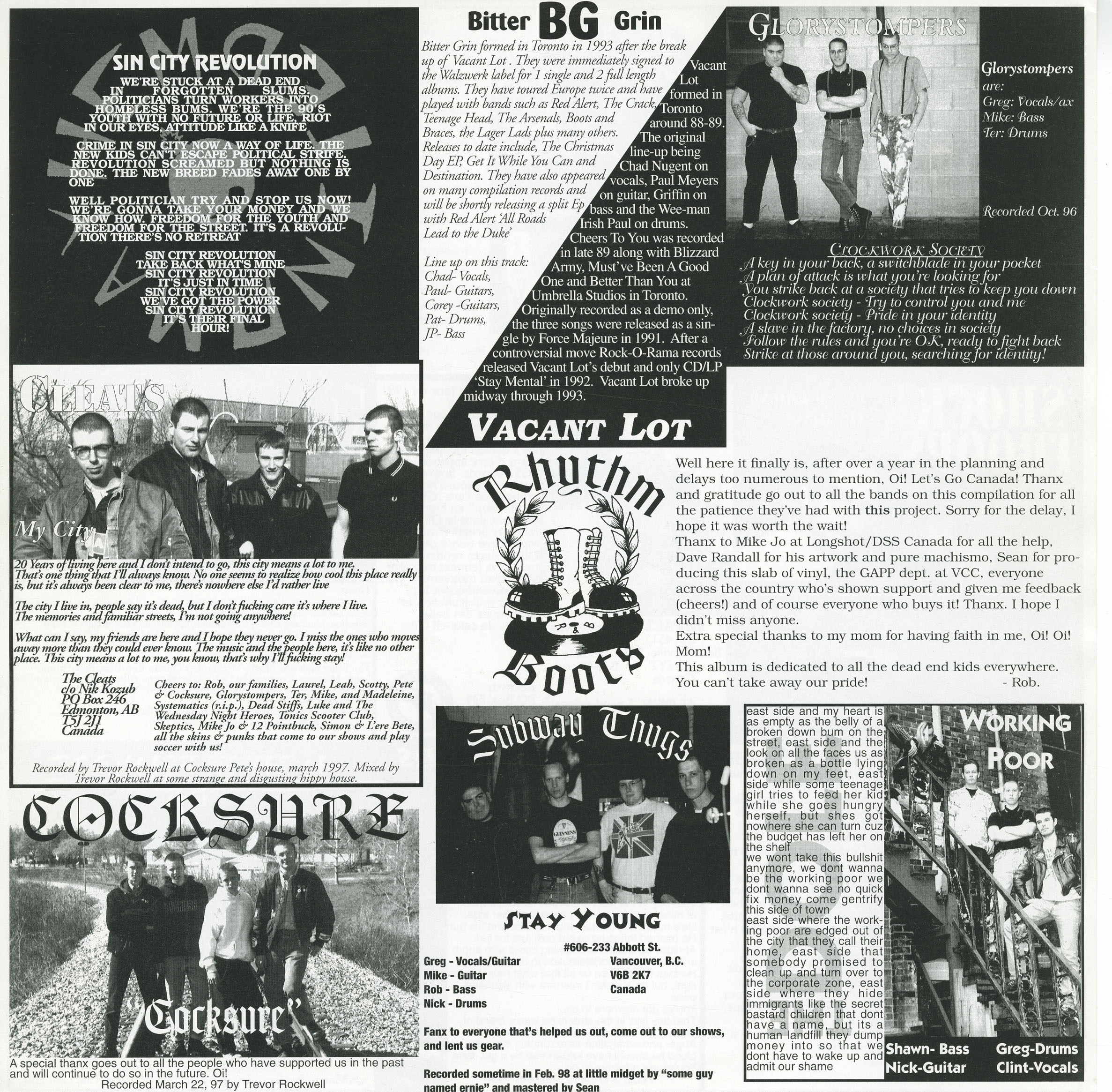 Cheers to: Rob, our families, Laurel, Leah, Scotty, Pete, Cocksure, Ter, Mike, Madeleine, Systematics (R.I.P.), Dead Luke and The Skeptics, Mike Jo & 12 Point Buck, Simon & L’ère Bête, all the skins & punks that come to our shows and play soccer with us!