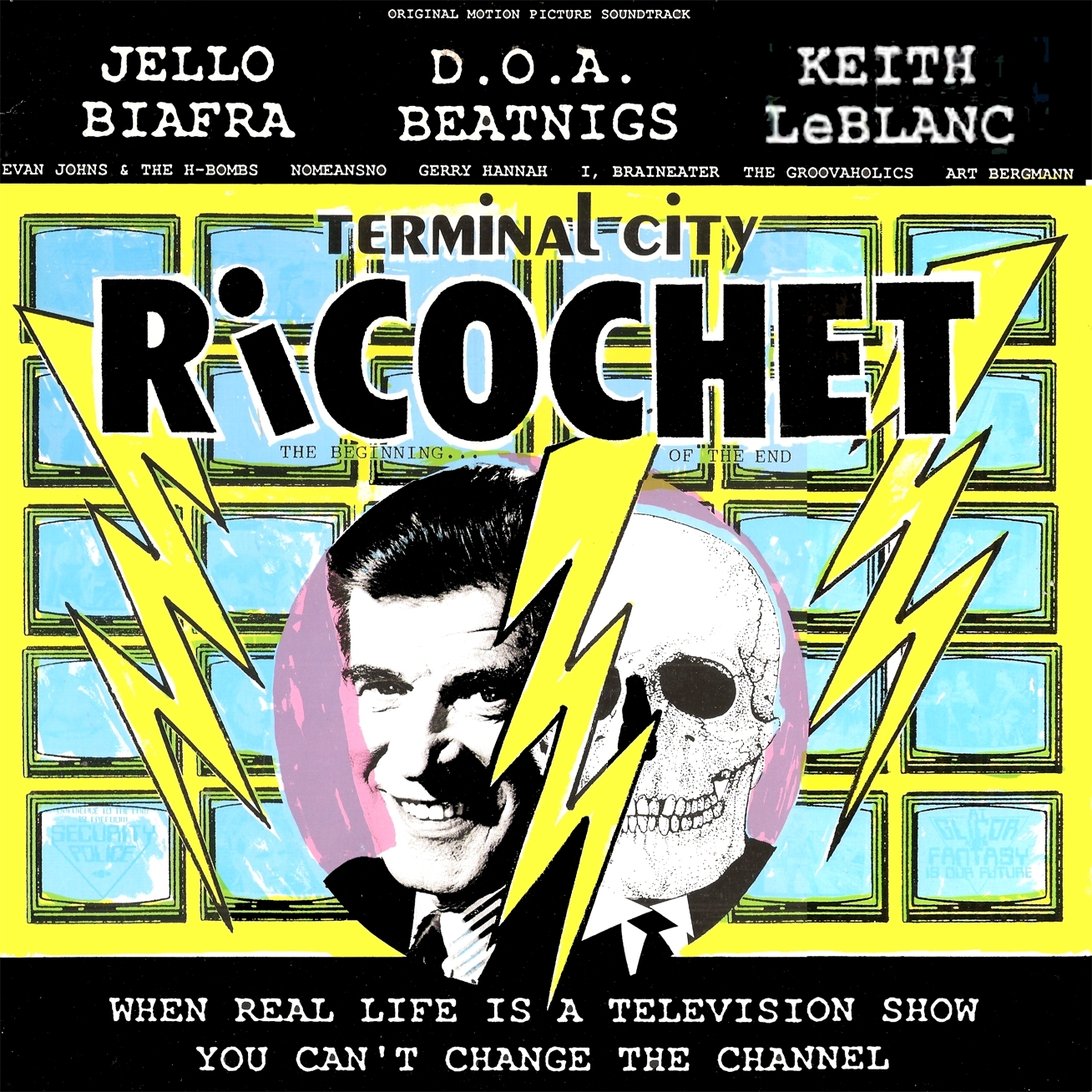 Starring Jello Biafra (of the Dead Kennedys), Terminal City Ricochet is a dystopian comedy critical of television and its collusion with government and consumerism. Terminal City Ricochet is well known in cult film circles, but it has only been shown at film festivals, and a few times on pay-TV. The DVD combo, (containing both the DVD of the film and a CD of the movie soundtrack) has been made available through the Alternative Tentacles Website. It was released in stores in October 2010.