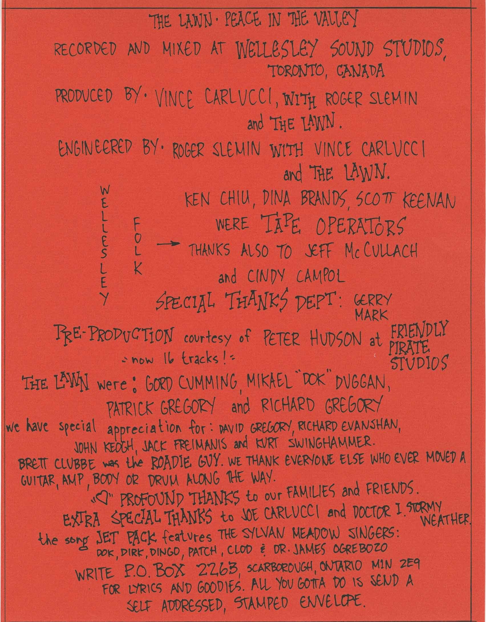 Although you were scene contemporaries of Blue Rodeo, The Rheostatics, Change Of Heart and Tulpa, the Lawn had a totally unique sound unlike anything else happening in Toronto at the time. In fact, I've played Peace In The Valley for a couple of people who thought you might be from Manchester because you reminded them of The Smiths. How did you arrive at your sound?