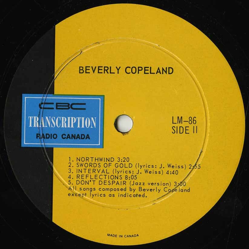 Beverly possesses a style of composition and interpretation all her own. Strict classification eludes her: it is folk and blues, with much of a jazz influence, and the artistry of the classical background, all in one. Two versions of “Don’t Despair” are sung on this recording: the first is reminiscent of the blues tradition and the second, which is the last song on the album, has a more contemporary jazz flavour in its rendition. The same folk blues idiom of the golden age of blues, permeated by the artist’s pain and the cry of the ragman, is the essence of “Good Morning Blues, Nothing Beautiful, Durocher, and Untitled (“Make the answer Yes”) span the spectrum of gentle, melancholy love songs of her repertoire. “Song From Beads” is a joyful sound that once more betrays a reflective core. Poems become the foundation of at least two songs: “Interval” is a tone poem, as Beverly describes it, where the music weaves together the silences and the sounds of dreams; “Swords of Gold” has its roots in 20th-century classical music at its most stark, and at the same time its most moving. “North Wind” and “Reflections” are basically different, but here the anguished mind finds its expression in two songs where the singer’s voice displays (more especially in “Reflections”) its most versatile qualities.