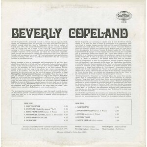 Beverly Copeland (who performed formerly as Beverly Glenn) began her folk-singing and songwriting career two years ago, as a singer with eight solid years of classical training behind her. Born in Philadelphia, she has been a resident of Canada since 1961. She attended McGill University and gave a number of McGill and CBC recitals (she was a winner of the 1964 CBC Talent Festival) before deciding in 1968 to change her style and enter a field that she felt allowed a more complete expression of her personality and which she found more compatible. Since then she has appeared on CBC local and national radio and television programs including “After Noon” and “Music to Remember”. Her first commercial record is set for release this fall.