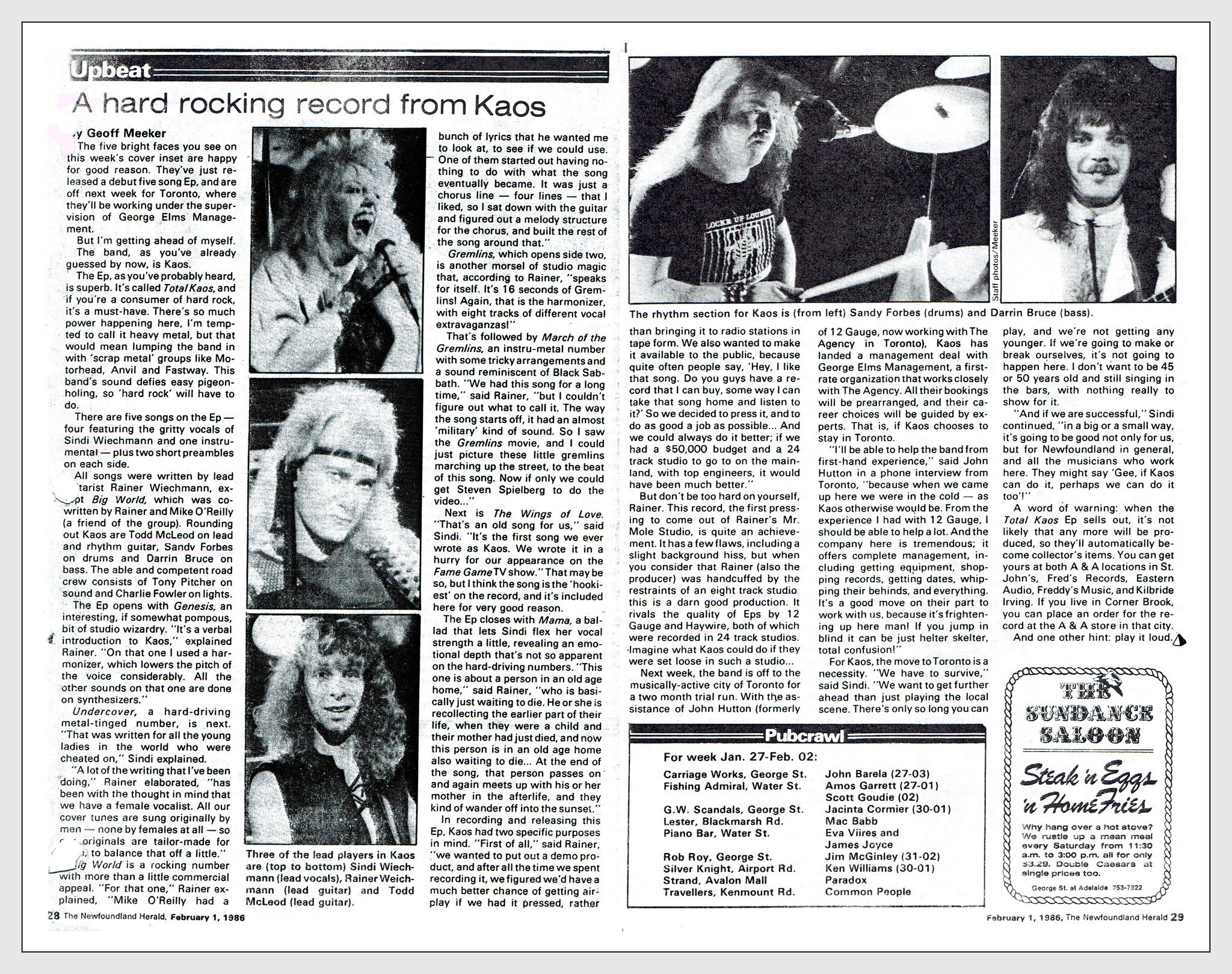 KAOS was the premier metal band back in the 80’s in NL, Canada most known for their song “March of the Gremlins”. This song was an instrumental on their debut LP TOTAL KAOS which every metal fan should try to locate. It had such a distinct guitar riff that made it easily recognizable.